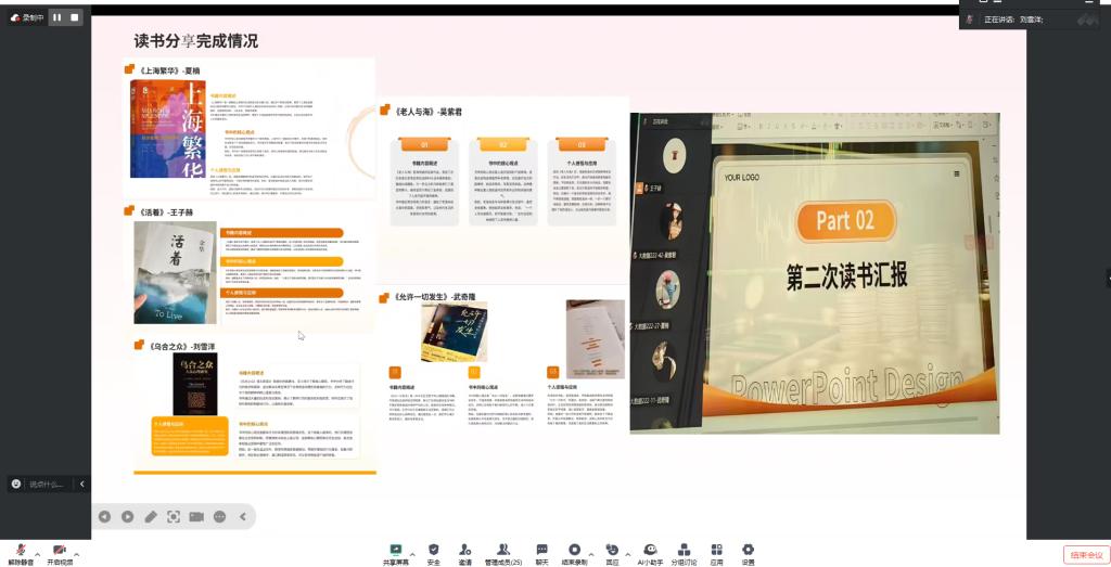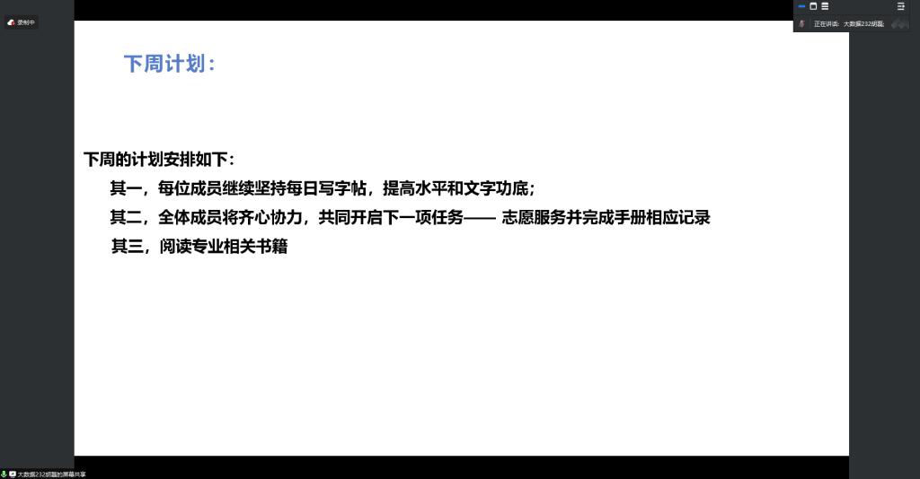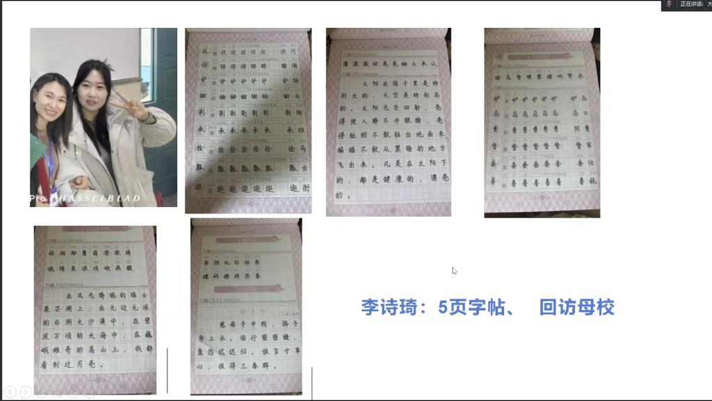 各小组代表分别汇报了第三周社会实践情况。6个小组展示了字帖临摹成果,每位同学都有进步,提升了汉字书写能力,传承了书法文化;SHSJ-209、SHSJ-211、SHSJ-212小组分享了阅读专业推荐书籍和哲学社会科学类书籍心得体会;SHSJ-212、SHSJ-214小组汇报了开展志愿服务情况,将知识学习与服务社会结合,以实际行动传递温暖,在奉献中收获成长;SHSJ-213小组李诗琦、胡磊、宋佳蓉、刘世豪、陈卓,SHSJ-211小组王智慧,SHSJ-214郭汝佳,SHSJ-210小组安博闻踏上回访母校之旅,重温青春记忆,为学弟学妹分享经验,助力成长。