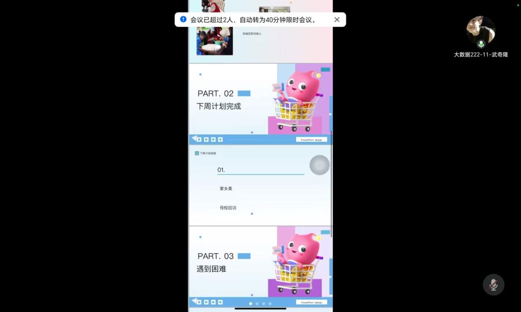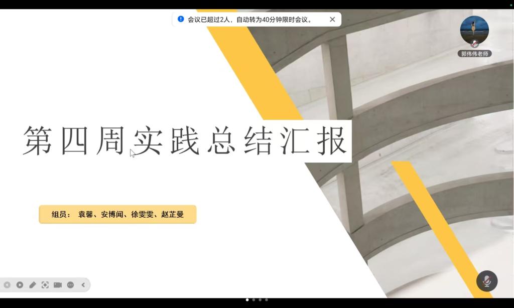 孙晗哲同学作为郭伟伟生涯导师的纵向班级班长,梳理了纵向班级各小组同学近期活动完成情况,进一步阐释社会实践学期各项任务具体实施要求,并向学弟学妹们分享了社会实践学期的经验,提出需要注意的问题。