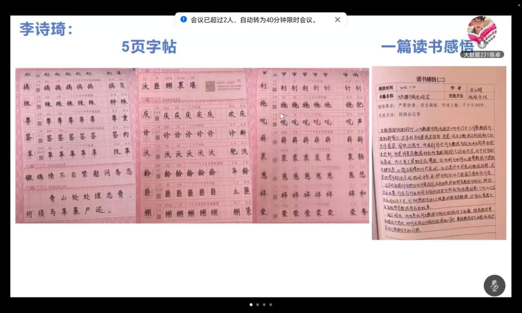会上,各小组代表汇报了第四周社会实践开展情况,分别展示了所有小组同学字帖临摹成果,其中,SHSJ-209小组开展了第一次志愿服务,SHSJ-210小组组织了第三次读书分享交流会,SHSJ-211小组进行了第二次读书交流活动,SHSJ-212小组开展了第二次志愿服务并完善调研报告,SHSJ-213小组组织了第二次读书分享汇报,SHSJ-214小组召开了第三次读书分享会。生涯导师郭伟伟对志愿活动过程中存在的难题进行了详细地指导,强调安全第一,并指出社会实践学期时间过半,同学们要及时完成社会实践学期的各项任务。