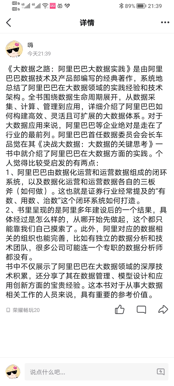 近日,大数据221班睢晨曦在濮阳市博物馆阅读了《大数据之路:阿里巴巴大数据实践》,它是由阿里巴巴数据技术及产品部编写的经典著作,系统地总结了阿里巴巴在大数据领域的实践经验和技术架构。全书围绕数据生命周期展开,从数据采集、计算、管理到应用,详细介绍了阿里巴巴如何构建高效、灵活且可扩展的大数据体系。对于大数据应用来说,阿里巴巴等企业绝对是走在了行业的最前列。阿里巴巴首任数据委员会会长车品觉在其《决战大数据:大数据的关键思考》一书中就介绍了阿里巴巴在大数据方面的实践。个人觉得比较受启发的有两点: