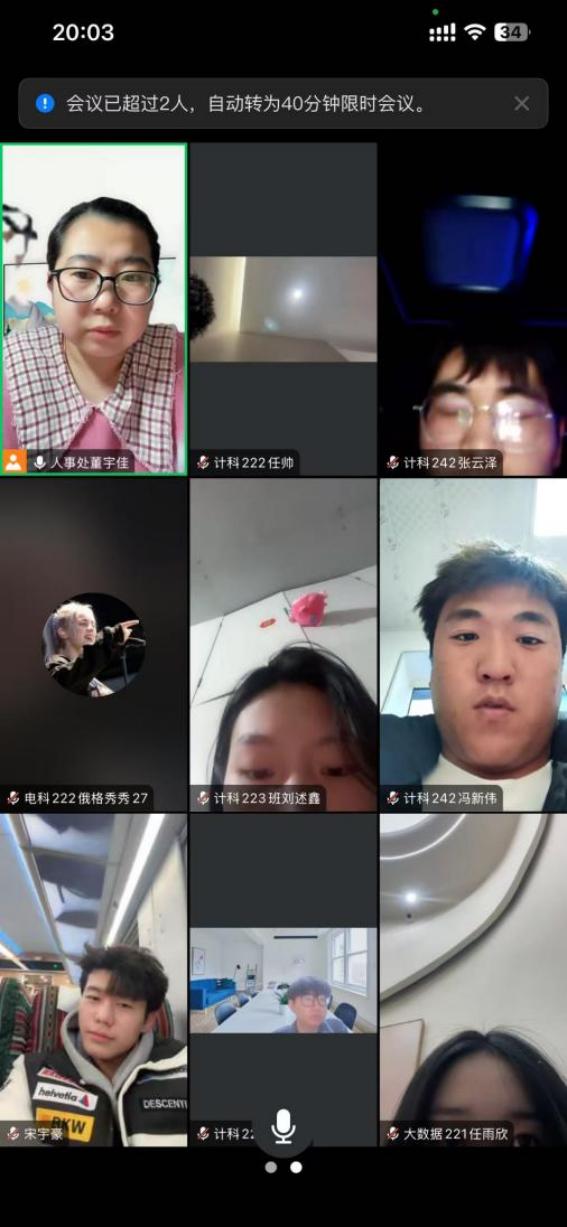 2月15日下午,董宇佳老师组织学生于腾讯会议召开了社会实践学期周总结交流会,本次会议由董宇佳老师主持,实践小组同学全员参加。