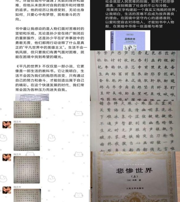 在本次社会实践活动中,本组按照计划完成了书籍阅读和临摹字帖等任务。其中,尹平同学深入研读了《悲惨世界》,对雨果的作品有了更为全面和深入的理解;郑玉成同学阅读了《冰原狼》,从中汲取了面对挑战和困难时的勇气与力量;陆芷卉同学则选择了《平凡的世界》;郑俊彤同学阅读的《百年孤独》。阳津宁同学阅读了《月亮与六便士》除了书籍阅读外,陆芷卉同学还进行了回访母校的活动。她回到曾经就读的中学,向学弟学妹们宣传了大学生活的多彩与丰富。