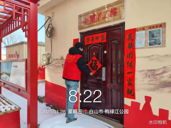 2025年1月28日,SHSJ-296组计科233班杨光在吉林省长白县进行社区贴春联志愿服务活动。