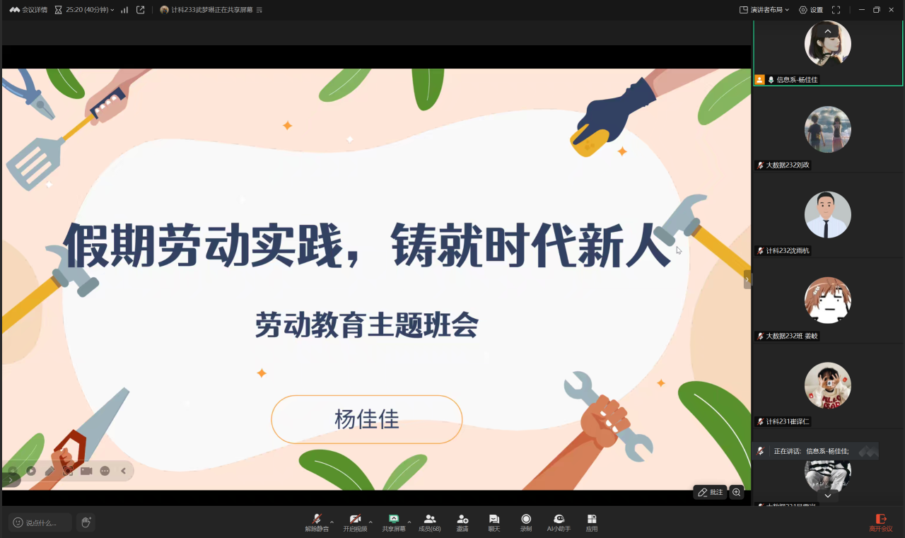 此次线上劳动教育班会的成功举办,为同学们的社会实践学期注入了新的活力。在轻松活跃的氛围中,同学们不仅学习了劳动知识,更点燃了劳动热情。相信在未来的日子里,同学们将带着这份对劳动的热爱,在实践中不断成长,为社会贡献自己的力量,让劳动精神在青春岁月中熠熠生辉 。