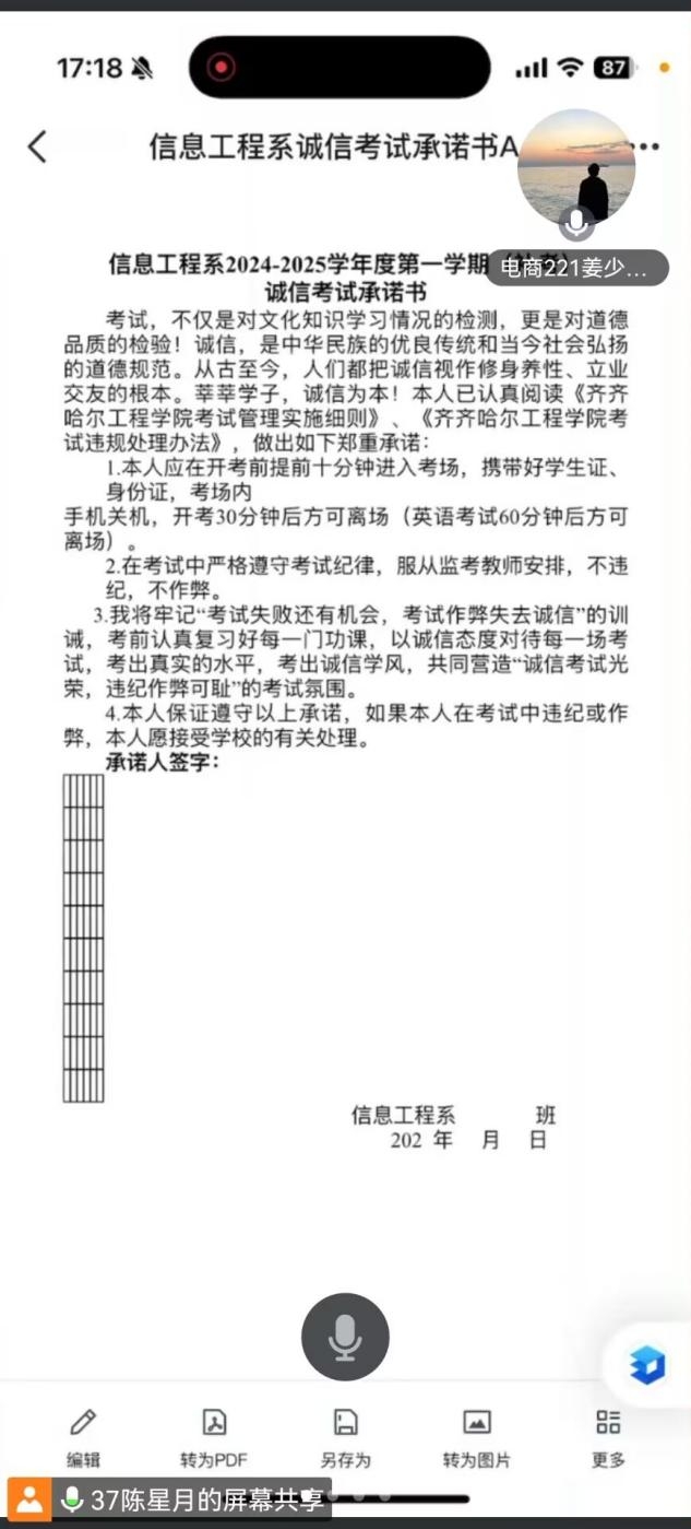为进一步加强考风考纪建设,强化同学们的诚信考试意识,3月2日,由信息工程系辅导员陈星月主持的电子商务专业21、22级补考考风考纪线上班会如期举行。此次班会聚焦信息工程系2024-2025学年度第一学期补考事宜,旨在为即将参加考试的同学敲响诚信警钟,助力他们以良好的精神风貌迎接考试。
