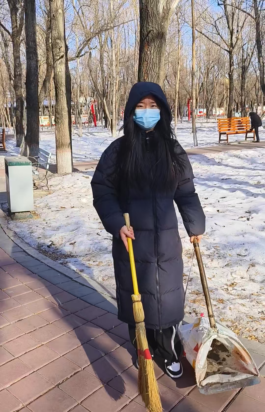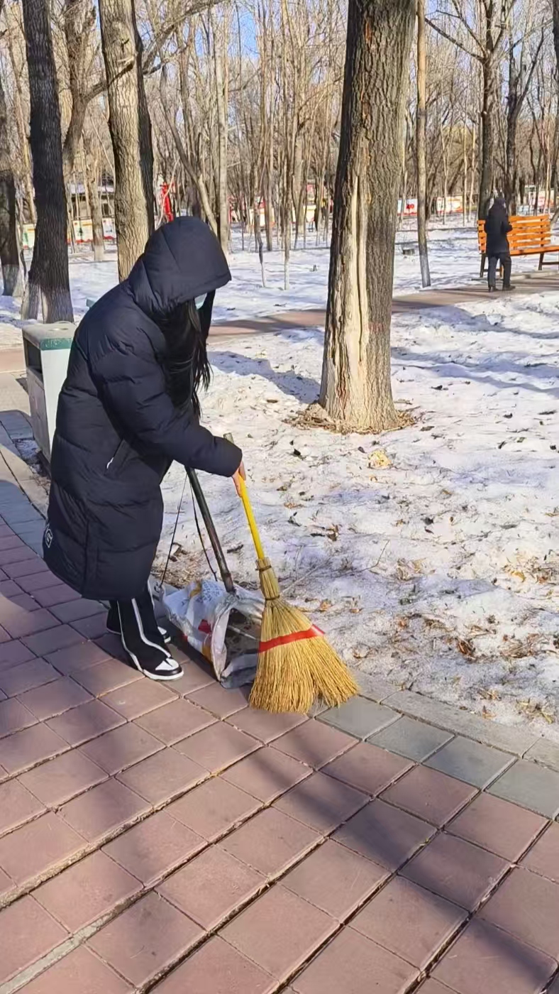 2025年2月14日上午,计科233班荆钰莹前往黑龙江省绥化市肇东市人民公园进行志愿服务,在此次服务中志愿者主要进行公园垃圾清扫,清除违规张贴的“小广告”等。