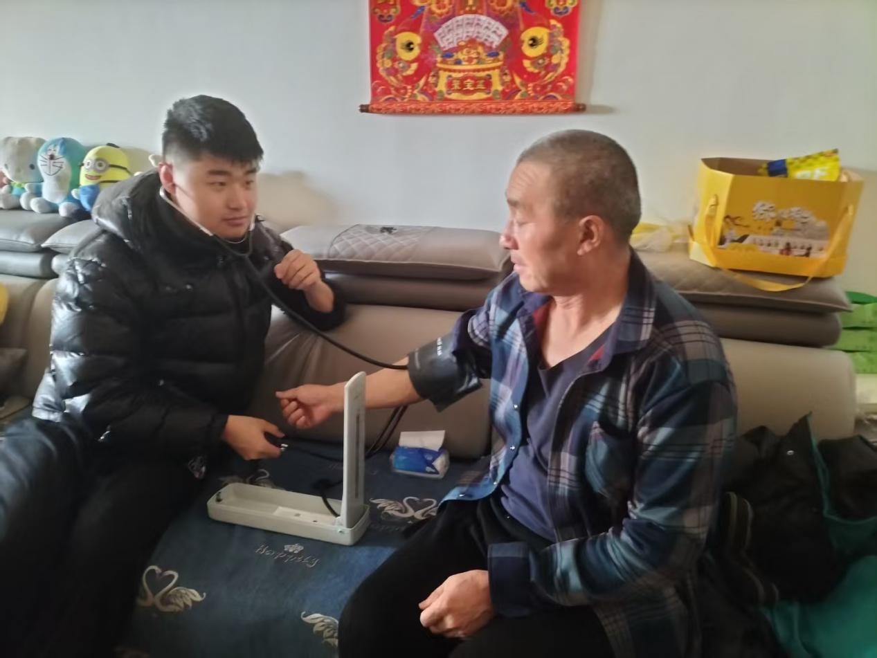 在寒假回到家乡的大学生志愿者们用实际行动传递着温暖,而孟凡海同学更是在这个特殊季节里,主动携带医疗器材走进村民家中,为独居老人测量血压、科普健康知识,用专业与温情守护老人健康。