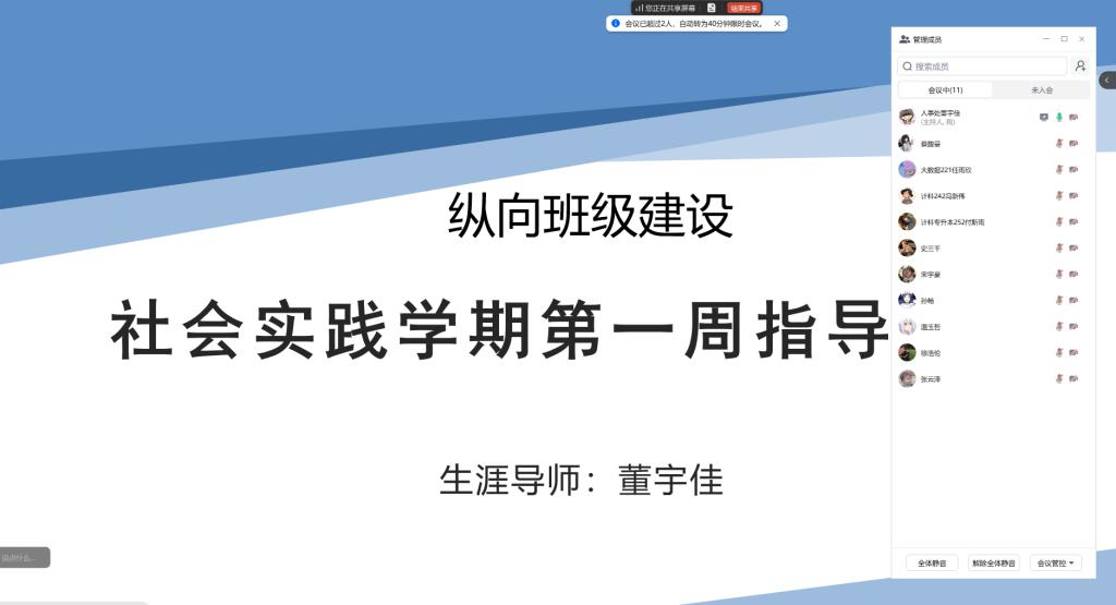 为扎实推进社会实践工作有序开展,切实为学生实践成长保驾护航,1月10日,生涯导师董宇佳借助腾讯视频会议平台,组织召开社会实践学期第一周总结指导会议,各实践小组共计10名学生全员参会。