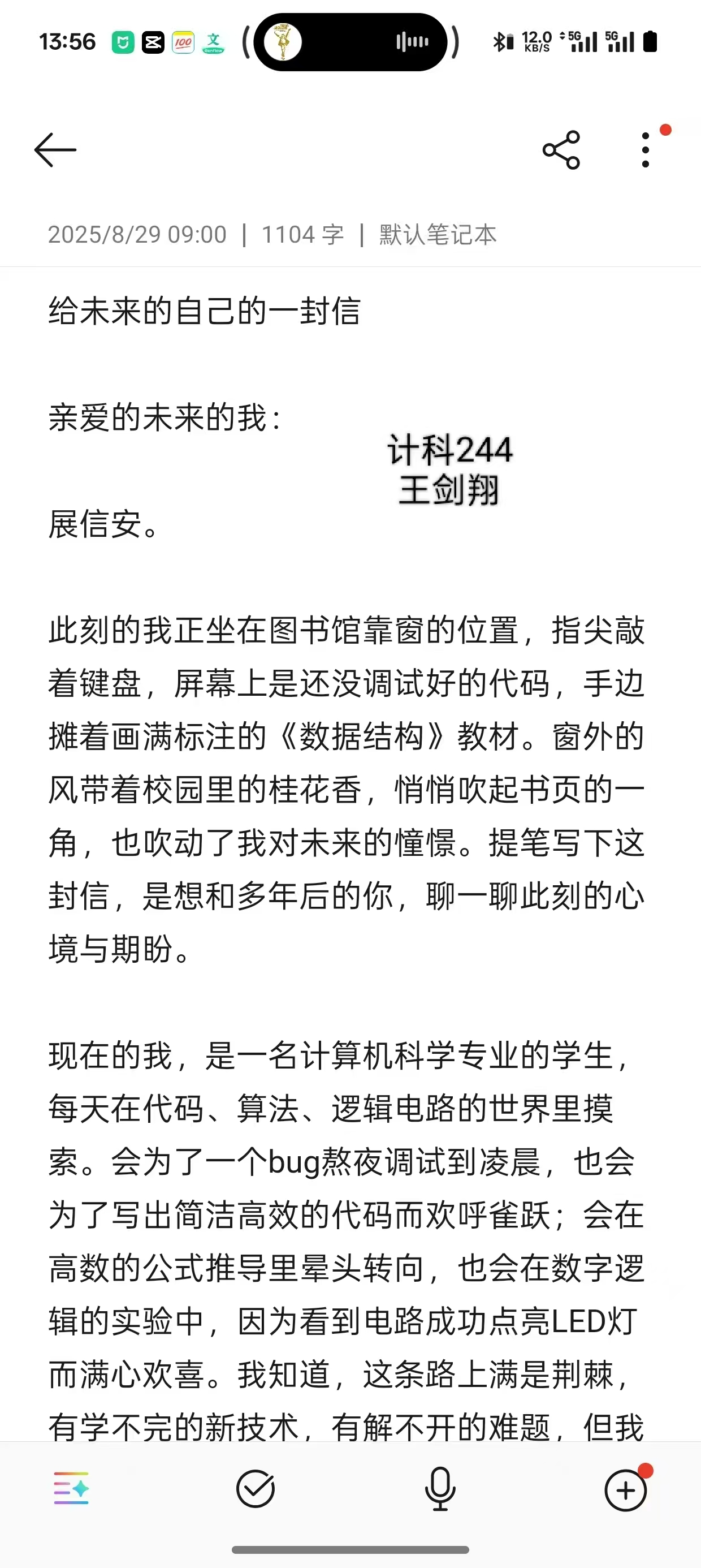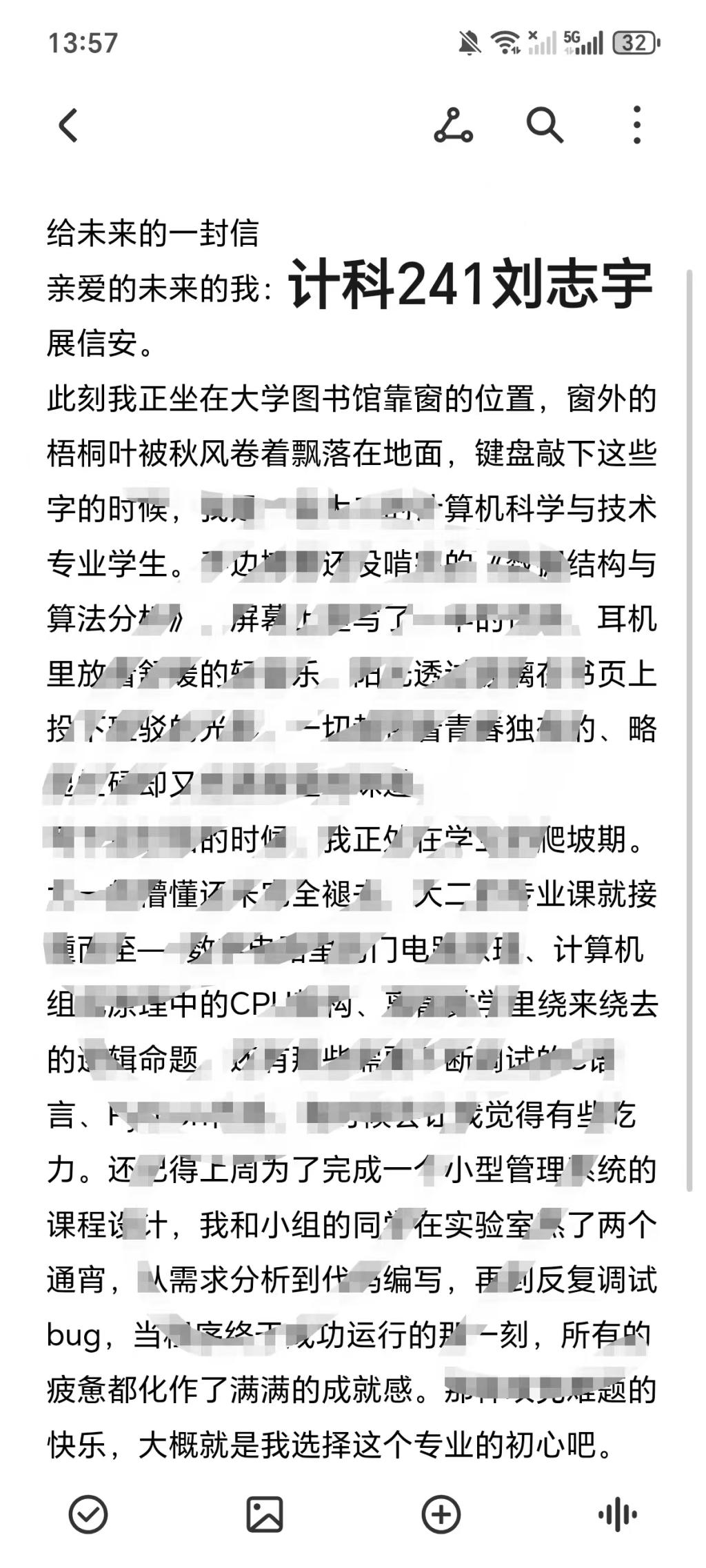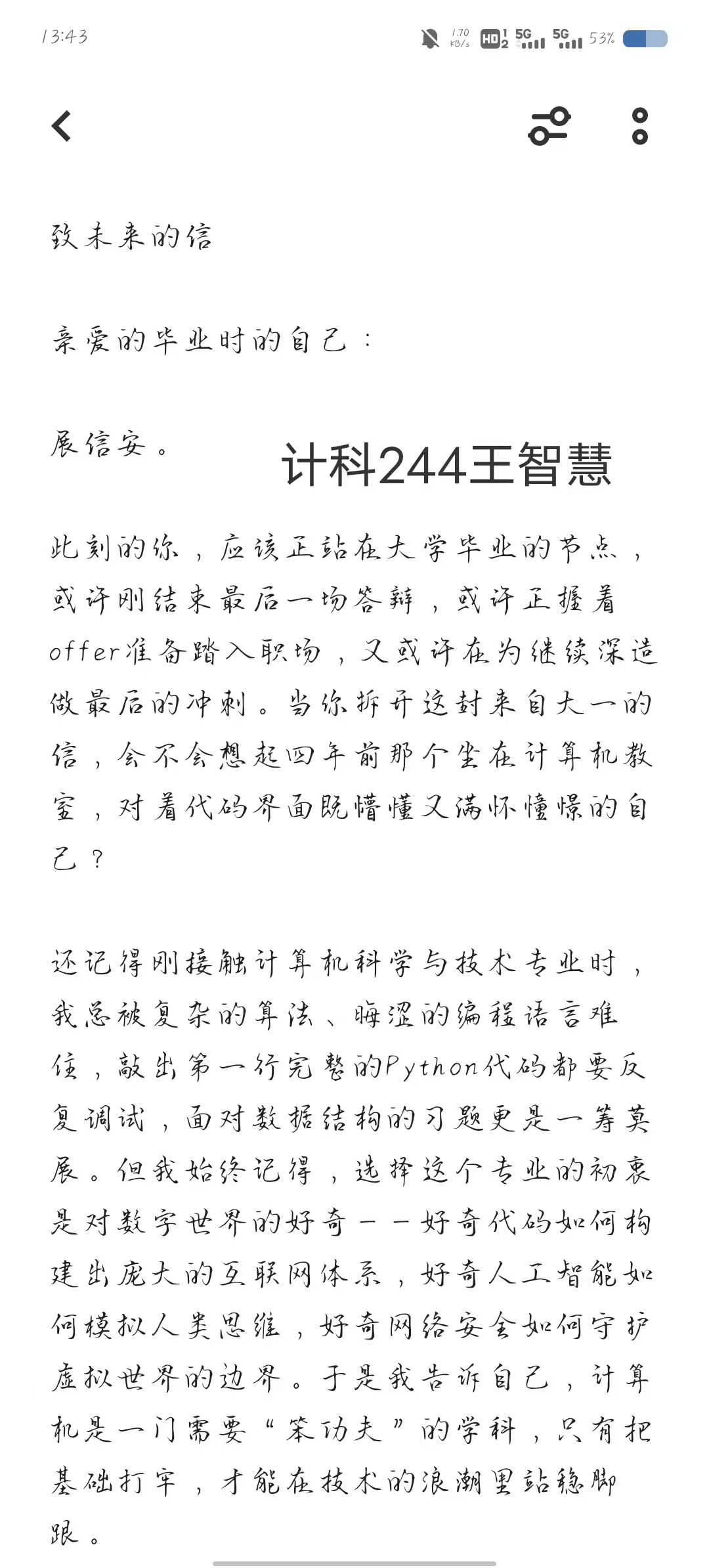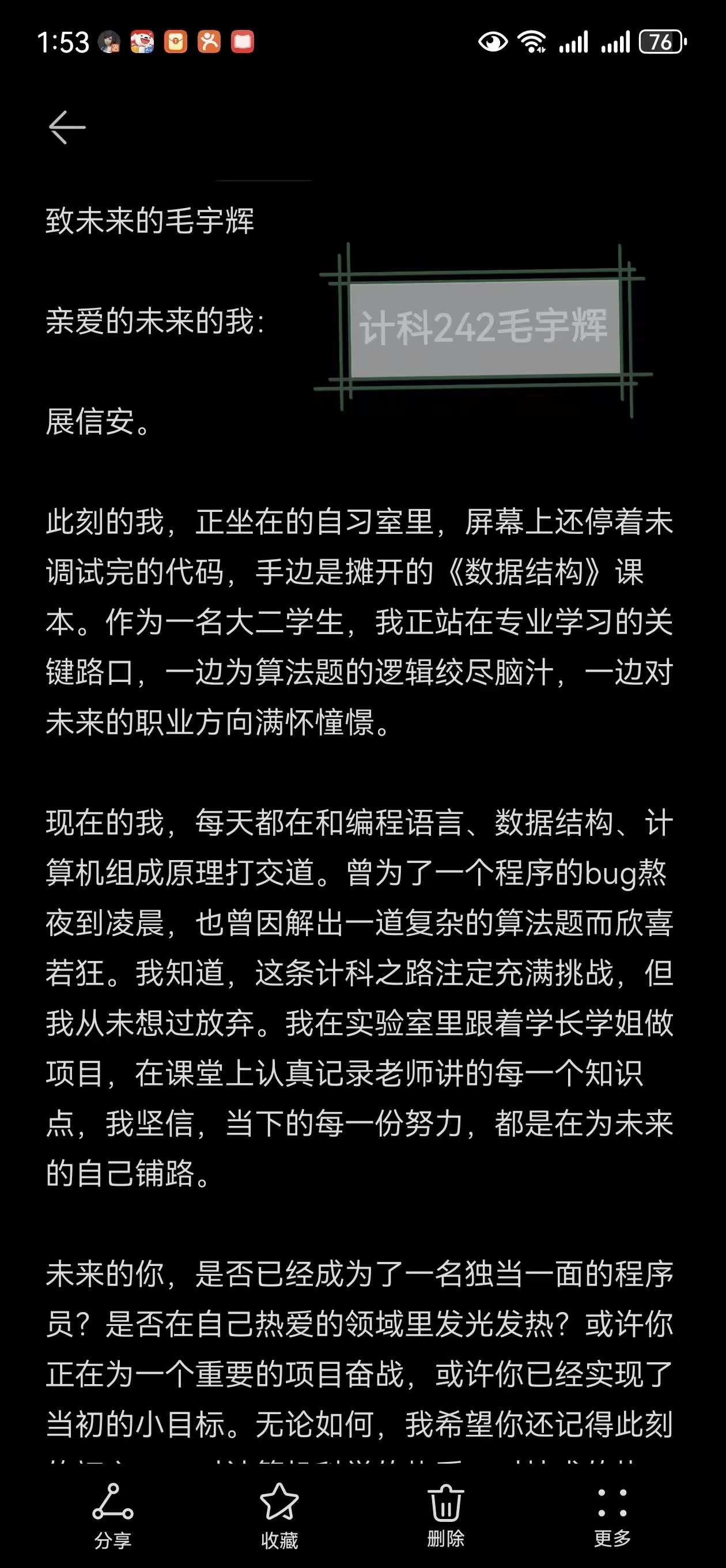 在“致未来的一封信”活动中,四位同学以纸笔为媒介,沉心与自我对话。他们或复盘学业成长的点滴印记,或勾勒未来职业的清晰蓝图,或立下深耕专业的铿锵誓言。王智慧的文字里满是对技术探索的执着,王剑翔聚焦综合能力的全面提升,毛宇辉将个人理想与时代发展相连,刘志宇则以温情笔触期许日常里的突破与成长。每一封信都承载着青春热忱,凝聚着对未来的无限憧憬。