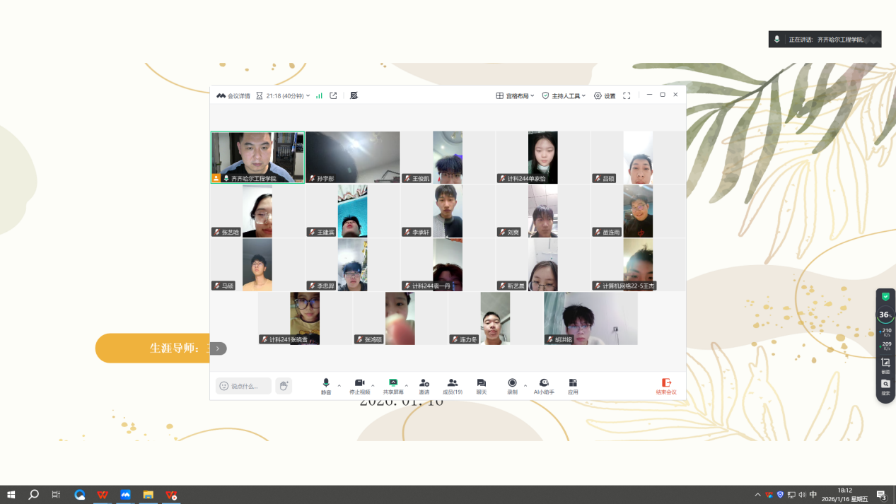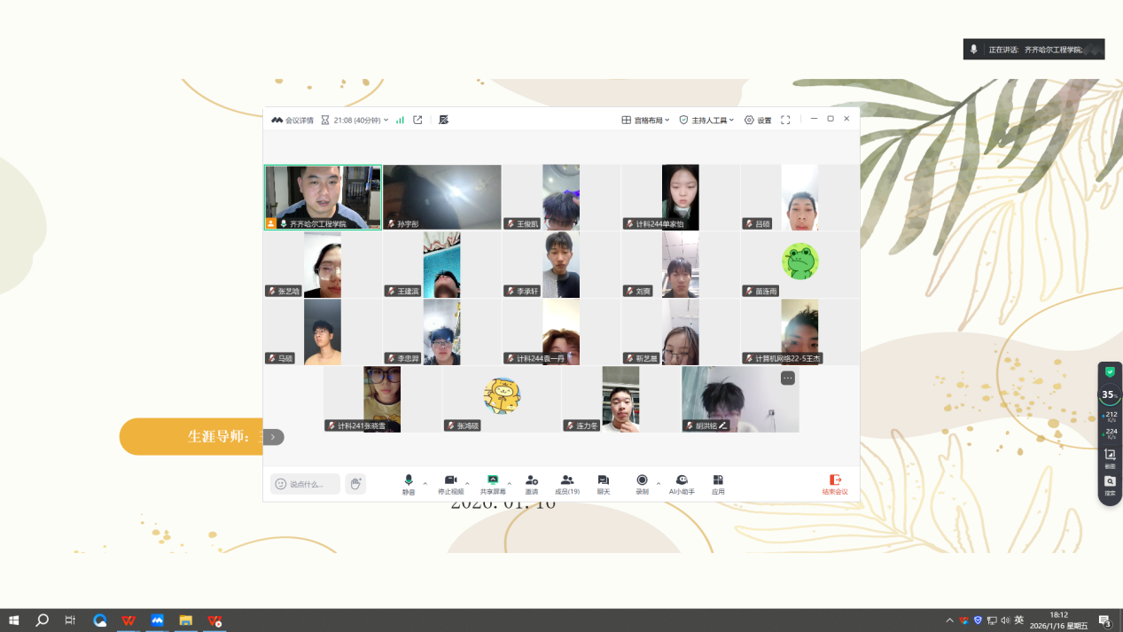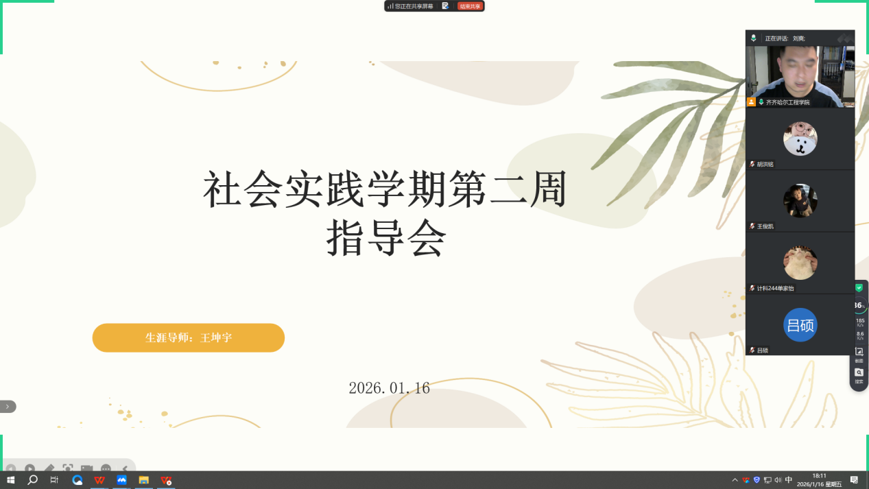 1月16日下午,社会实践学期第二周指导会通过腾讯会议顺利召开,由生涯导师王坤宇主持,19名生涯学生全程参与。本次指导会聚焦实践进度推进与任务深度融合,旨在进一步夯实"五育并举"落实成效,明确任务结合要点,确保实践工作稳步提质。