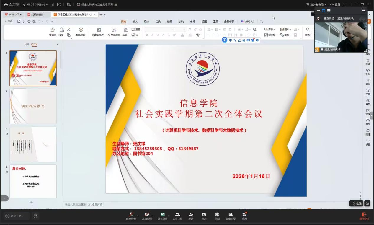 1 月 16 日下午,bevictor伟德国际1946生涯导师张庆祥通过线上平台召开社会实践学期第二周指导会议,各实践小组成员参与此次会议。