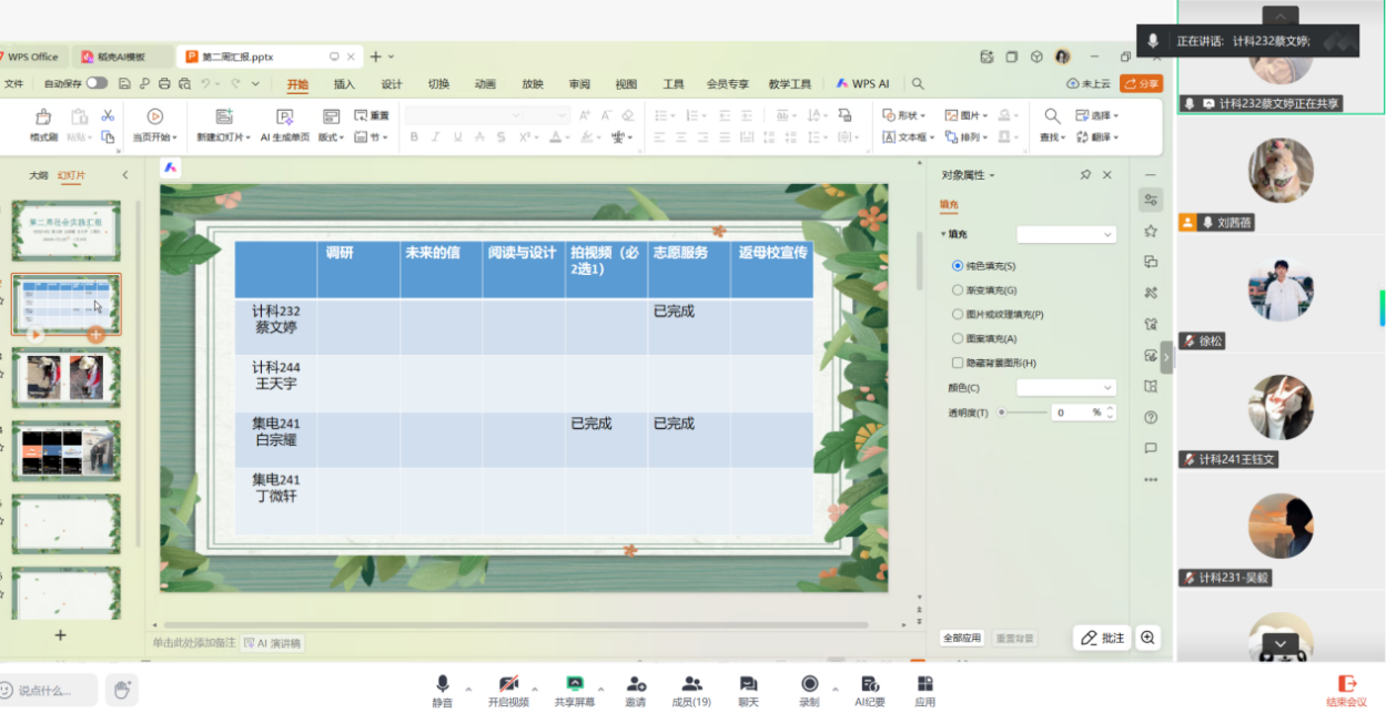 其次,刘茜蓓老师对多数同学完成视频拍摄的推进成效及高博小组的专项成果给予肯定,同时针对未开展活动、视频未定稿等问题作出明确提醒。她重点鼓励全体成员:“当前实践已进入关键推进期,多数同学的执行力值得肯定,但部分同学仍未启动活动,需尽快调整状态。望大家紧盯目标、加快进度,在保障成果质量的同时,抓紧完成各类未竟任务,确保实践活动有序推进。”