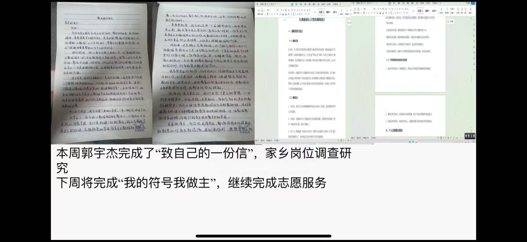 针对下周的安排,小组初步制定了两项目标任务,分别是全员完成“致未来的一封信”撰写与开展回访母校活动。其一,完成《致未来的一封信》撰写工作。结合自身成长历程、当下学习状态及未来发展规划,深入梳理内心感悟与成长思考,以真挚细腻的笔触,写下对未来的憧憬期许与坚定承诺,定格当下心境,寄语明日自我。其二,开展母校回访活动。提前与母校相关负责人沟通对接,细化活动流程、明确分工安排。通过与昔日恩师亲切座谈、漫步校园重温往昔时光,全面了解母校近年的发展变迁与建设成就;同时分享自身求学经验、备考技巧及成长心得,为学弟学妹答疑解惑,提供力所能及的帮助与指引,传递温暖与正能量。
