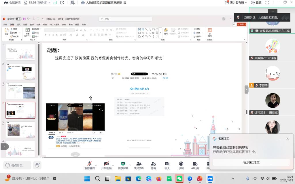 数据科学与大数据技术专业李诗琦小组(李诗琦、宋佳蓉、胡磊、刘世豪),李诗琦小组以 “青春 fun 肆拍” 推进短视频实践,围绕 “寒假生活” 策划内容,抖音为传播平台。成员完成智育课程后,李诗琦拍舞蹈视频、胡磊记录美食制作;宋佳蓉同步开展企业调研与智育课程学习,刘世豪参与志愿活动并完成线上课程。小组总结流量引入方法,明确后续方向。