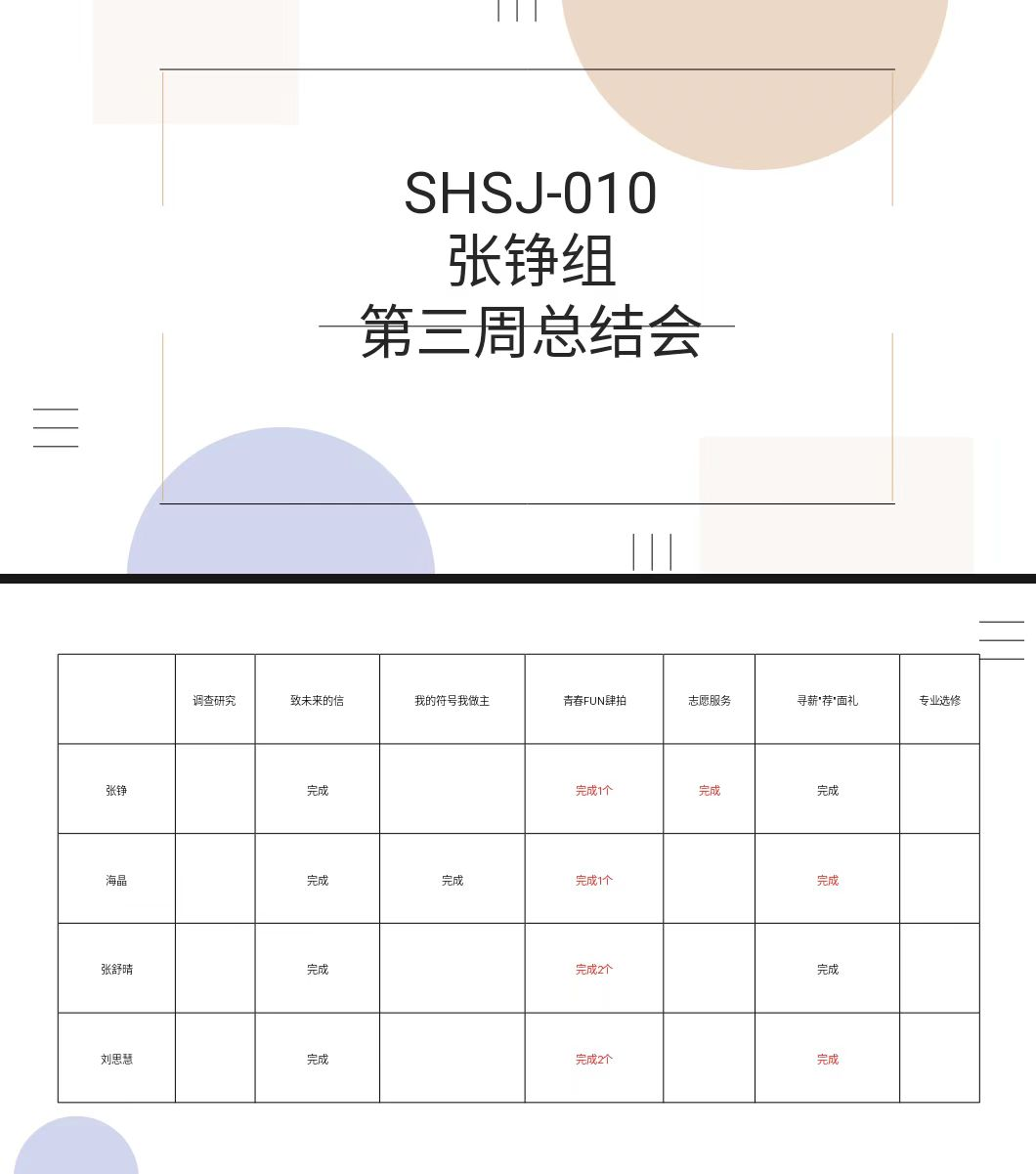其次,小组成员依次汇报各自实践项目的具体推进情况,详细说明当前进度、已完成成果及遇到的实际问题。汇报结束后,张铮对本次总结会内容进行汇总梳理,逐一明确各项目当前进度节点,结合成员研讨提出的解决方案,优化并敲定第四周具体工作分工:张铮、海晶负责完善调研数据整理工作,确保数据真实准确、分类规范;张舒晴、刘思慧牵头推进“我的符号我做主”项目优化完善,打磨成果细节;同时,着重强调成员间需建立每日简短沟通机制,及时同步工作进展、衔接相关事项,避免工作脱节。