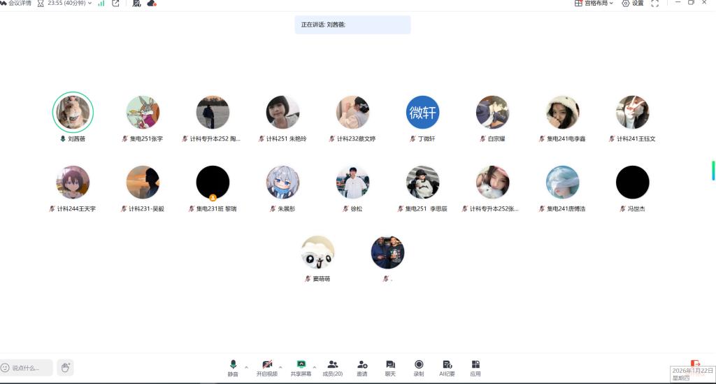 1月22日下午,社会实践学期第三周总结会通过腾讯会议形式召开。会议由指导教师刘茜蓓主持,20位实践学生悉数参会,核心围绕本周实践任务推进情况、存在问题及后续工作计划展开详细汇报与部署,旨在全面复盘阶段工作、精准破解难点,保障后续实践稳步推进。