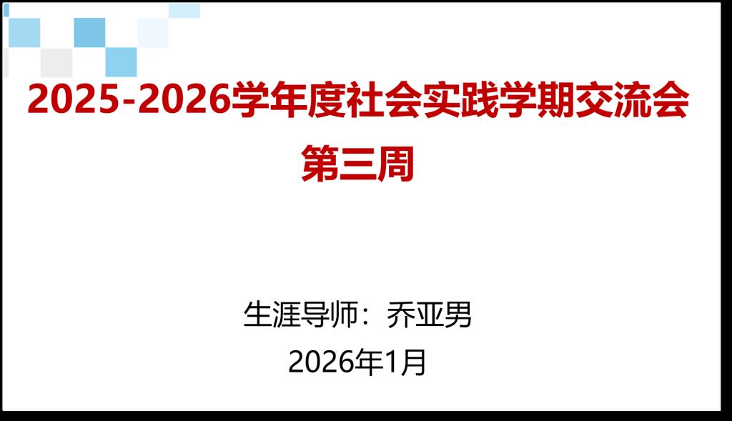 1月25日晚,SHSHJ-077组以腾讯会议形式召开2025-2026学年社会实践学期第三周总结交流会。会议由生涯导师乔亚男主持,小组全体成员参会,集中复盘第三周实践活动进展情况,并为后续工作开展明确方向。