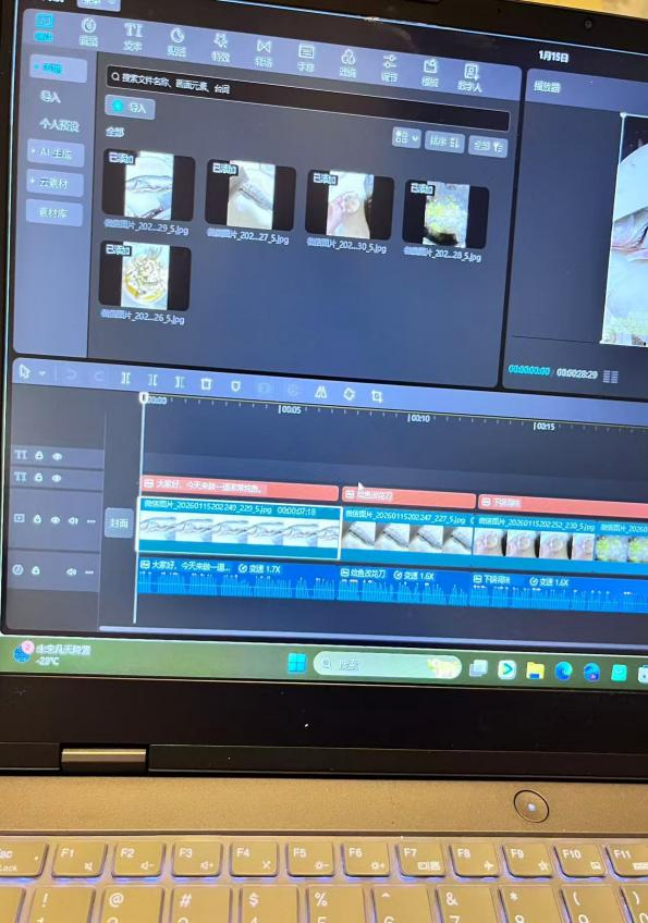 组员马慧在首条短视频初版的基础上,补充拍摄多组寒假户外活动素材,将新素材与原有内容进行整合剪辑,反复优化配乐与字幕效果,最终完成2条寒假生活短视频的定稿工作。