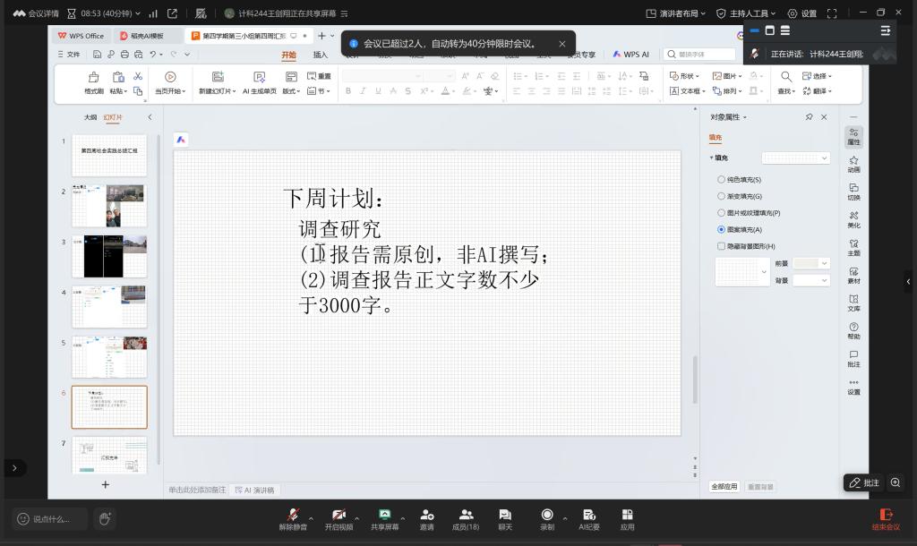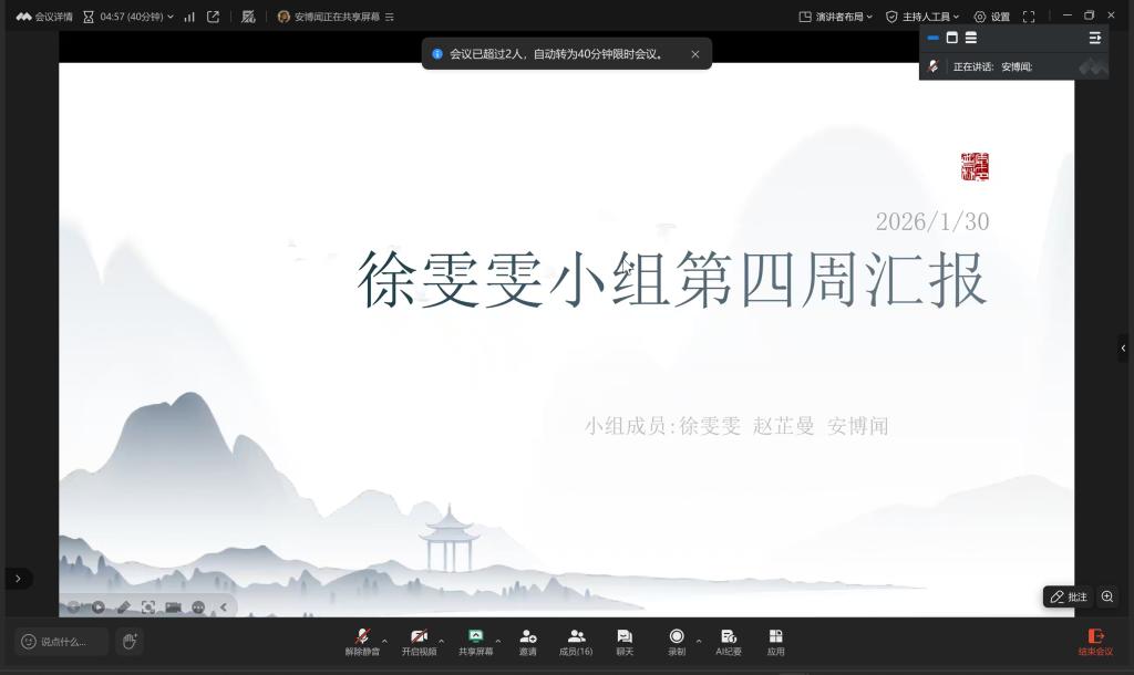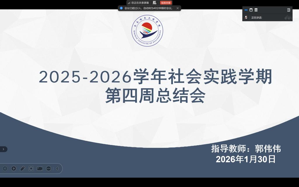 2026年1月30日晚,指导教师郭伟伟召开社会实践学期第四周指导会议,会议通过腾讯会议线上召开。