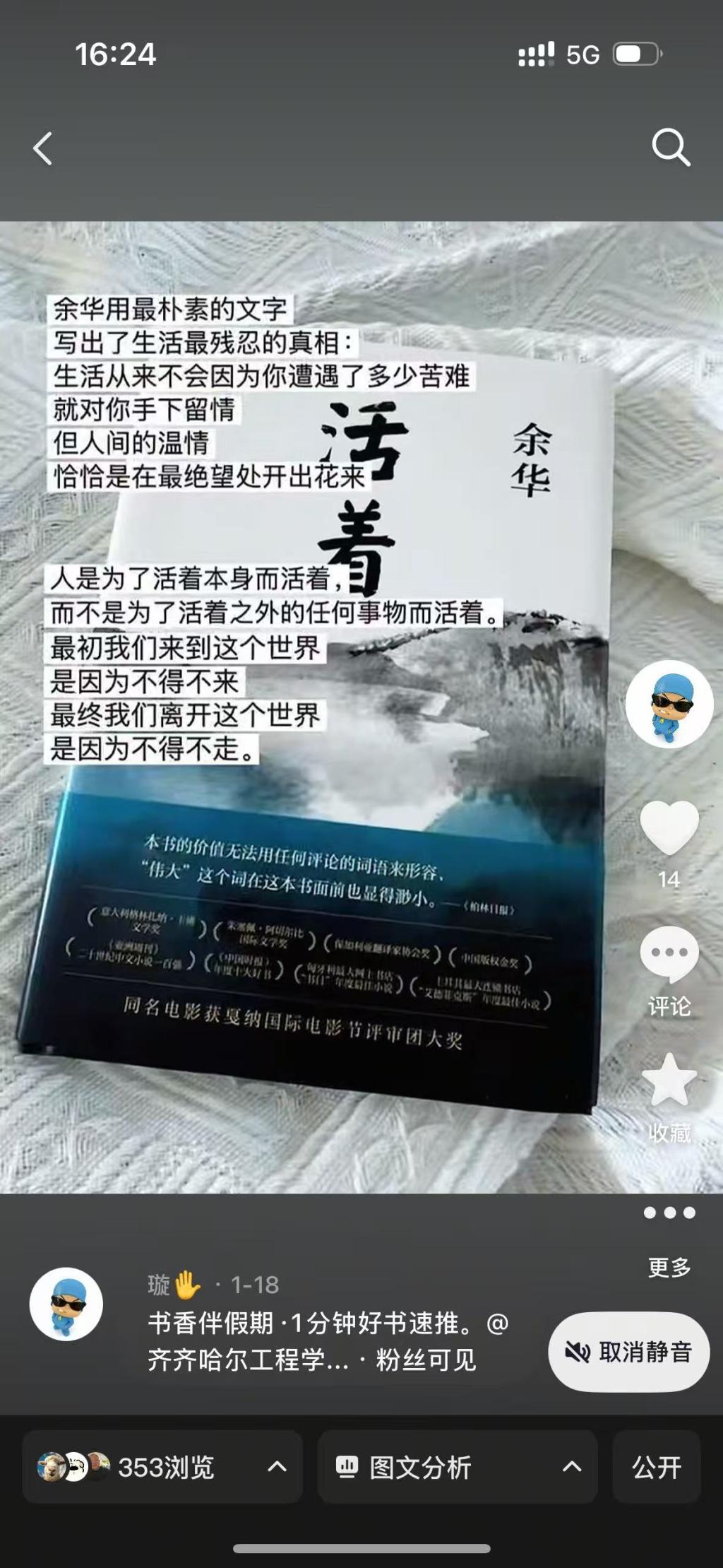 肖永浪同学完整阅读了《活着》,结合主人公跌宕的人生经历分享读后感:人是为了活着本身而活着,而不是为了活着之外的任何事物而活着。最初我们来到这个世界是因为不得不来,最终我们离开这个世界是因为不得不走,生命的本质便是直面苦难、安然前行。此外,肖永浪同学对“社会志愿行”项目开展情况进行总结,梳理了实践成果与优化思路。