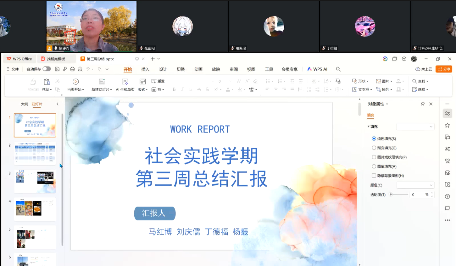 首先,本次总结交流会由指导教师杨静霞牵头组织,核心目的是全面总结第三周社会实践任务完成情况,听取各小组任务推进与收获汇报,针对性强调实践过程中的注意事项,统筹布置下周实践任务,保障全体学生有序推进社会实践各项工作。