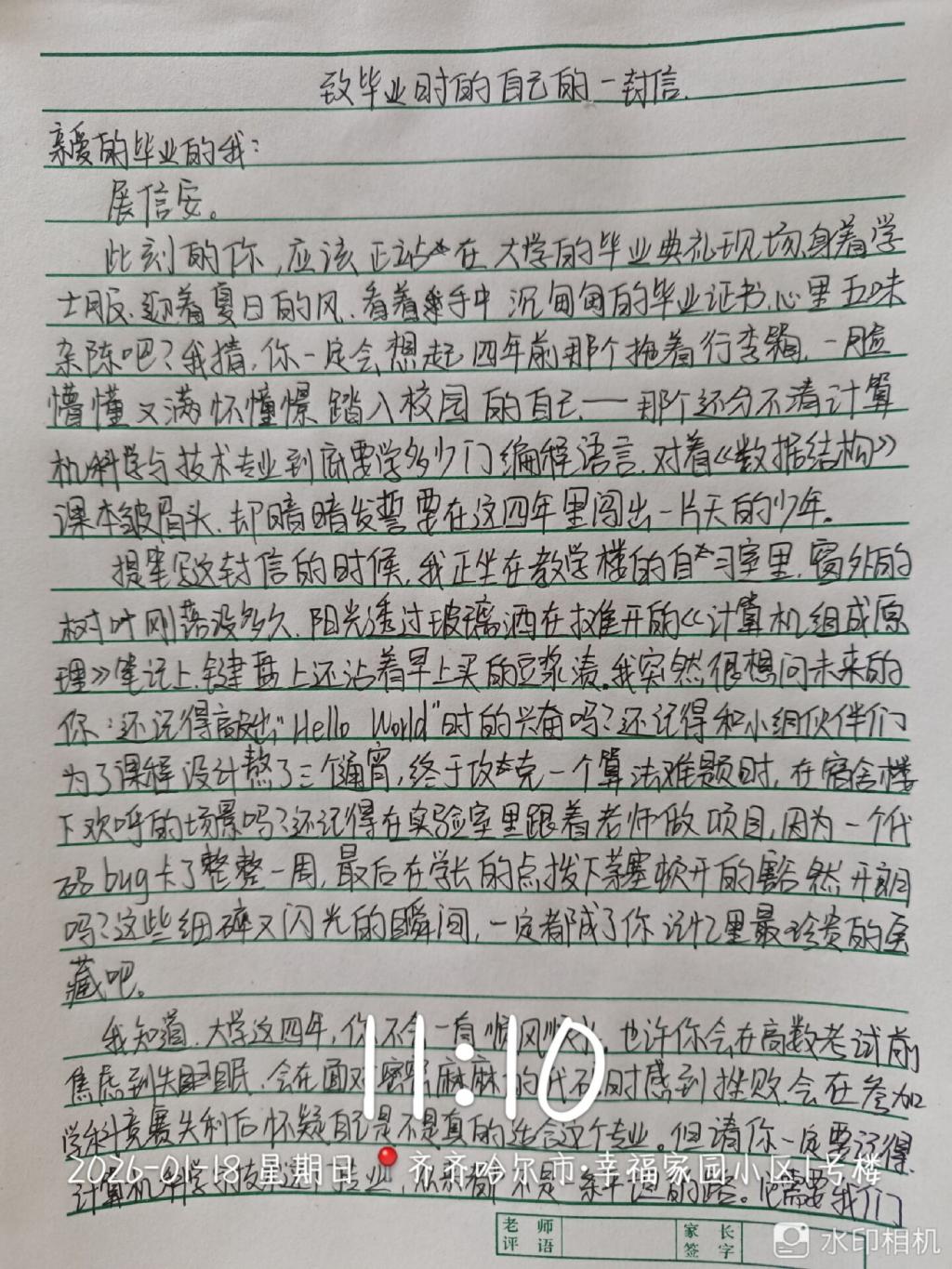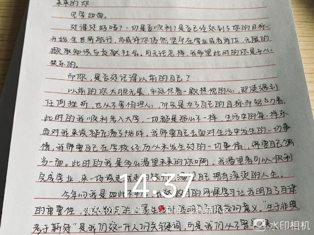 随后,小组按“书信创作+母校回访”双主线同步推进活动,各成员分工协作、有序落实,动态成效显著。在“致未来的信”创作环节,侯蕊、刘瑞、曹宇涵三位组员分别以不同视角落笔,用心勾勒成长轨迹、锚定未来方向:侯蕊结合自身在伟德国际1946的学习体验,回顾从懵懂入学到明确专业目标的蜕变历程,书信篇幅达1500余字,情感真挚且逻辑缜密;刘瑞聚焦“成长”主题,分享实践中的收获与感悟,对未来学业提升与能力培养提出具体期许,语言朴实有力、充满奋进力量;曹宇涵结合所学专业及学校合作企业资源、微专业培训等优势,细致规划大学期间学业重点与能力提升路径,表达了未来投身行业、实现自我价值的坚定信念,内容兼具专业性与前瞻性,格式规范、字迹工整。与此同时,王鑫同学独立推进母校回访专项工作,他返回高中母校后,面向民办本科分数段的高中生及家长开展精准宣讲,条理清晰地解答了专业选择、校园生活、未来就业等常见疑问,有效传递了学校的办学理念与育人成果,获得了现场听众的积极反馈。