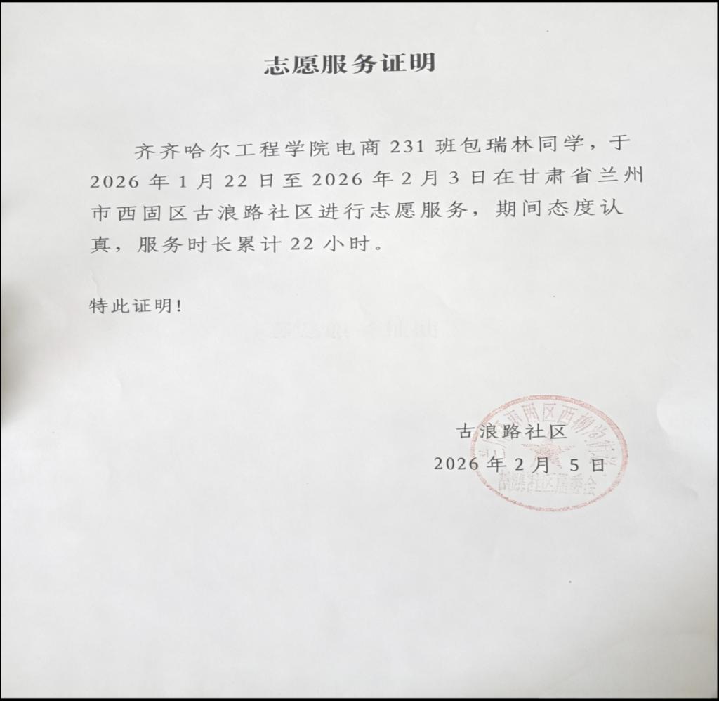 据了解,包瑞林同学于2026年1月22日至2月3日在古浪路社区开展志愿服务,累计服务时长22小时。服务期间,她始终以饱满的热情、认真的态度投入工作,不仅严格遵守社区规章制度,更充分发挥电子商务专业特长,将专业知识与社区实践深度融合。她主动运用电商运营、新媒体传播等技能,为社区公益宣传提供创意支持,助力优化宣传内容与服务流程;同时以耐心细致的态度为青少年开展知识科普,用专业能力丰富社区服务内容,提升服务效率与传播效果。