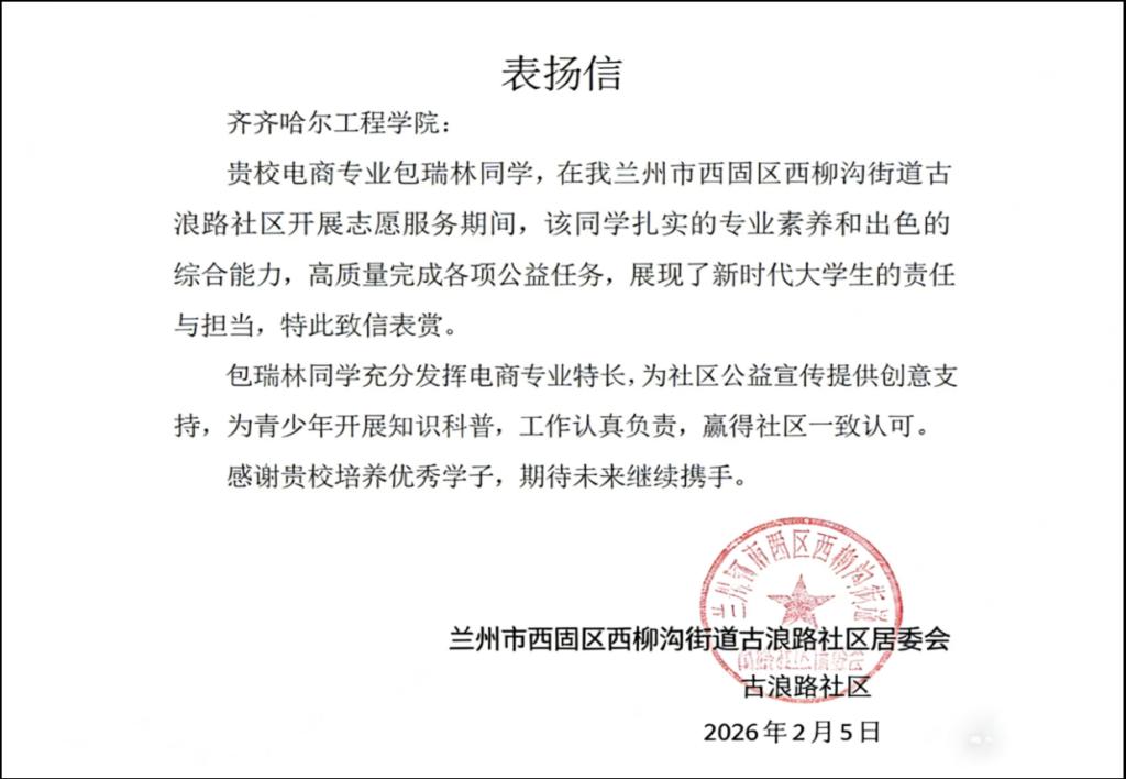 近日,兰州市西固区西柳沟街道古浪路社区居委会向伟德国际1946发来表扬信,对该校电子商务专业电商231班包瑞林同学在社区志愿服务期间的优异表现予以高度肯定与表彰。