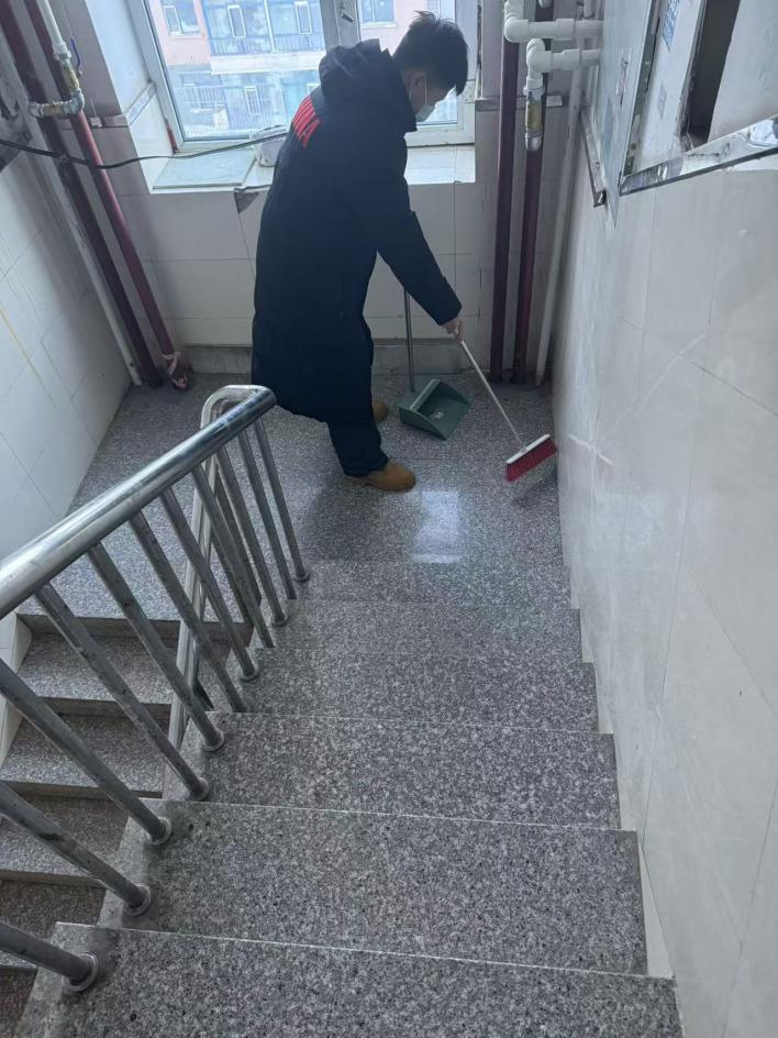 在社区居民区,志愿者们开展环境整治活动。大家手持扫帚、垃圾袋等工具,清理路面垃圾、社区楼层垃圾治理。