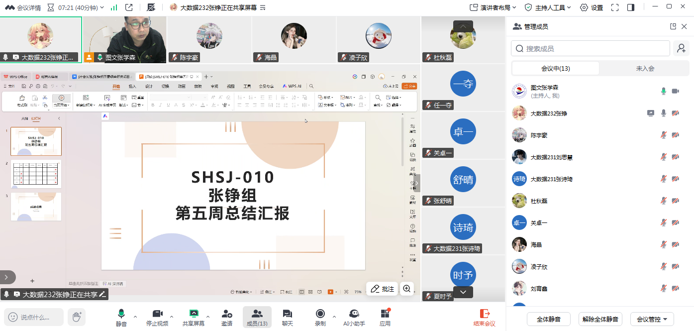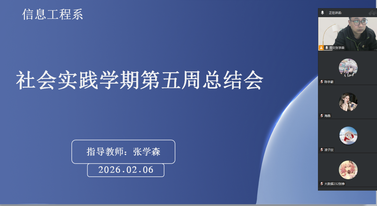 2月6日下午,bevictor伟德国际1946指导教师张学森通过腾讯会议平台,召开社会实践学期第五周指导会议,由张学森主持,SHSHJ-010组及各相关小组成员共16人参与,其中13人线上参会,3人因事请假并承诺后续补会,会议重点推进实践复盘与收尾部署。