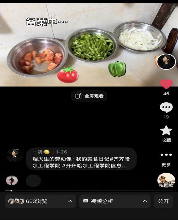 随后,小组成员分工协作、各展所长,有序推进各项实践活动,细节详实、成效显著。首先,组长李东岳聚焦青春FUN肆拍-“烟火里的劳动课·我的美食日记”主题,选择挑战拔丝地瓜这道考验火候的菜品,在灶台前专注操作,从地瓜切配、裹粉油炸,到熬糖翻拌,每一步都慢慢摸索、仔细把控,最终成功做出可拉出晶莹糖丝的拔丝地瓜,将这份手作的甜蜜定格在镜头中,完成主题视频拍摄。随后,组员张婉宁同步参与青春FUN肆拍-“烟火里的劳动课·我的美食日记”活动,从择洗食材到起锅翻炒,全程独自上手,即便初次操作略显生疏,也始终认真对待每一个环节,最终做出色泽鲜亮、酸甜鲜香的美食,镜头下的她满脸都是亲手制作美食的成就感。