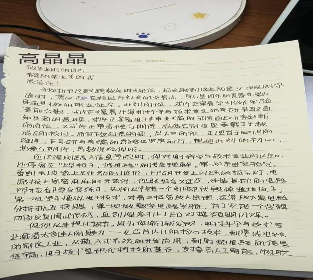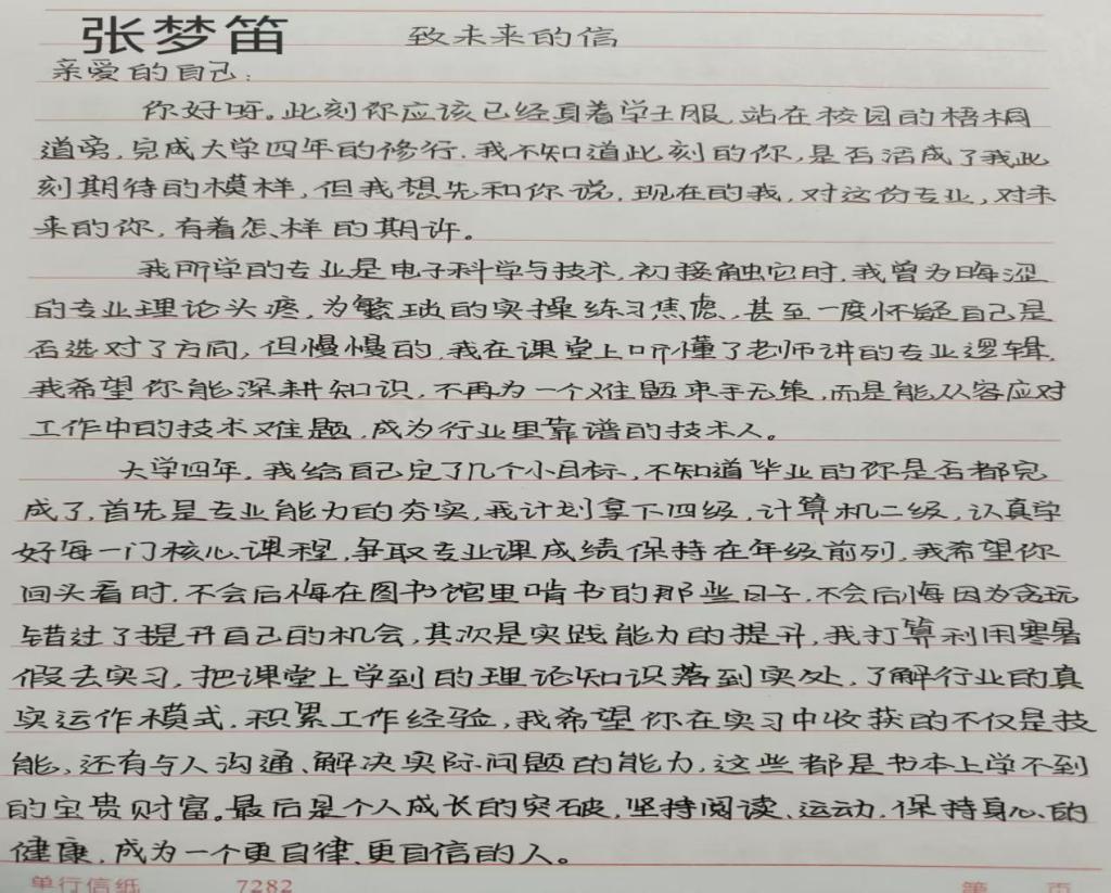 小组成员结合在校实验课中焊电路板的经历,写下对未来成为技术人的期许;回顾初入专业时的迷茫,记录下“从焊错引脚到能独立调试代码”的成长历程;大家还给自己定下“拿下四六级、深耕专业知识”的目标,希望未来的自己能成为行业里靠谱的技术人。大家在信纸上写下自己的失误,憧憬未来的职业图景,工整的字迹里满是青春的热忱与坚定。