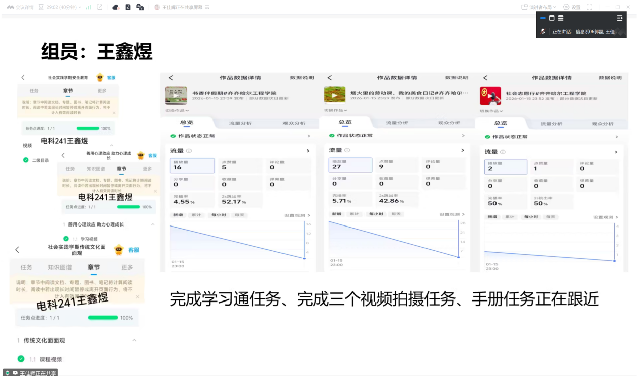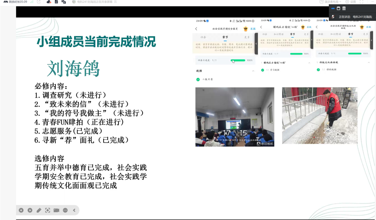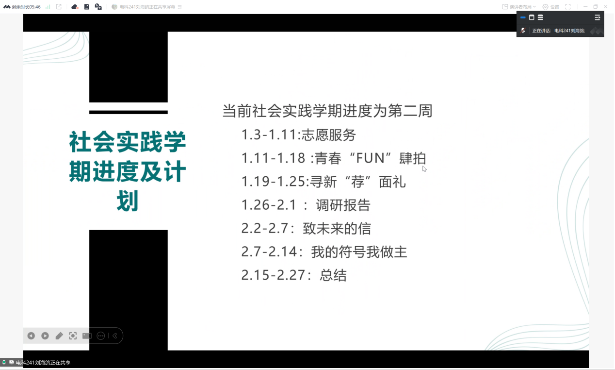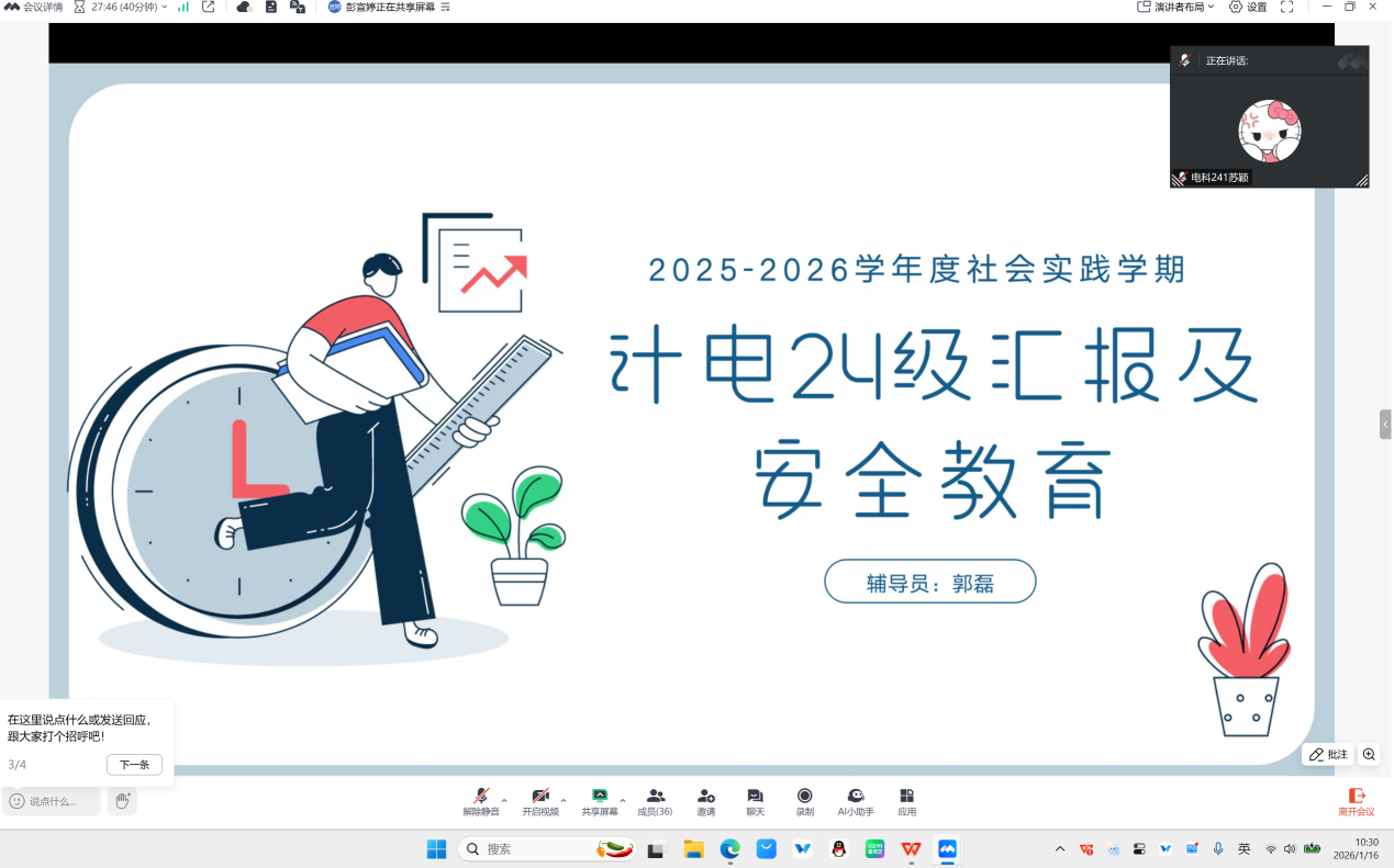 1月16日上午,电科241班在线上召开第一周社会实践学期进度汇报暨安全教育会议。本次会议由辅导员郭磊主持。电科241班共五十余人参加。