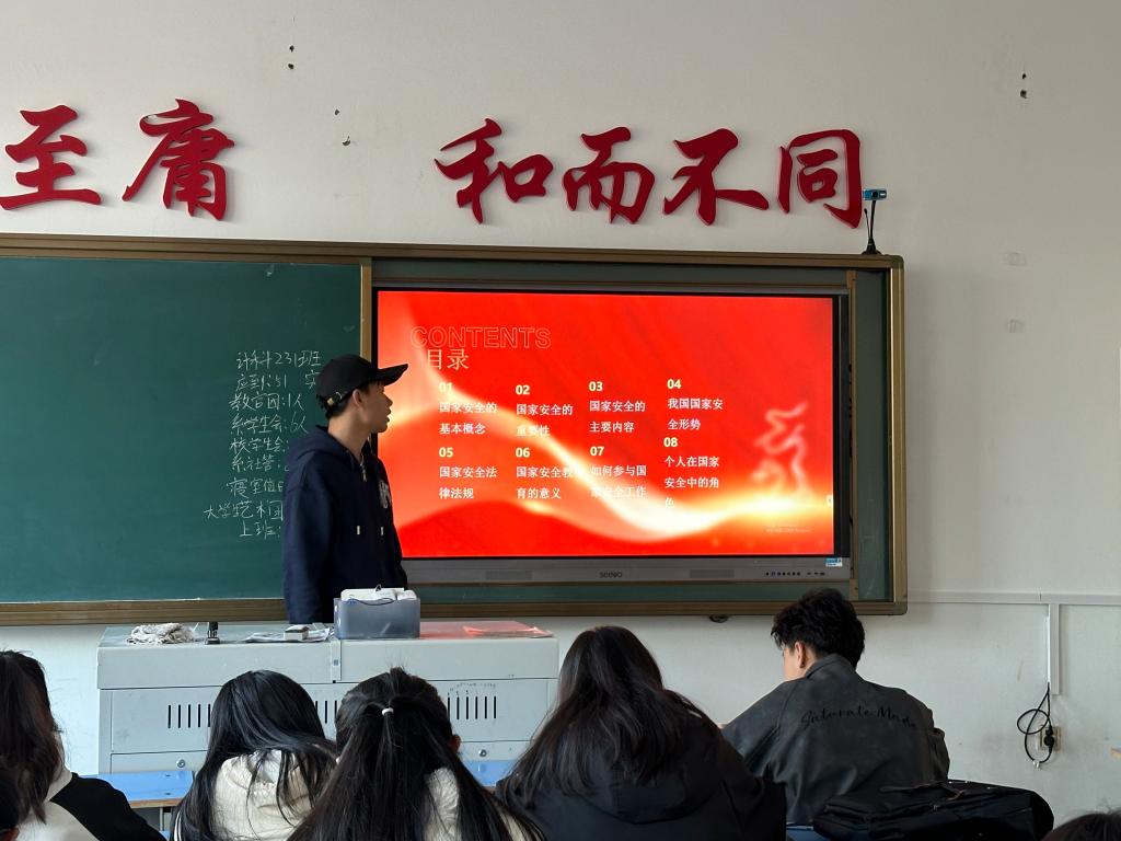 会议开始,王中旭同学通过ppt展示、视频播放的形式,向同学们普及了国家安全的相关知识。他不仅介绍了国家安全的基本概念,国家安全的定义,国家安全是指一个国家在政治、经济、军事、文化等各个领域,能够维护其主权、独立和领土完整,保障人民生活安定和社会和谐。国家安全的内容,国家安全包括领土安全、政权安全、经济安全、社会安全等多个方面,它们相互关联,共同构成了国家的安全体系。还引导同学们从政治、经济、科技等多个角度思考国家安全问题。本次班会旨在通过教育引导,提高大学生对国家安全的认知,增强他们的国家安全意识和责任感。