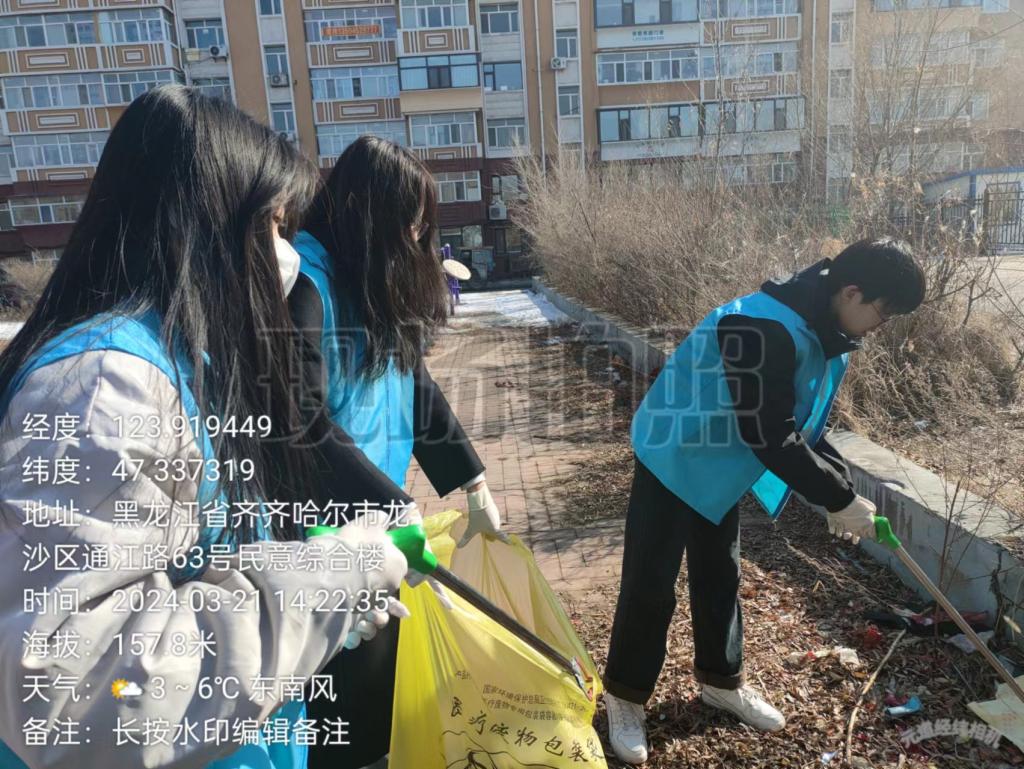 3月21日下午,计科233班青工委员荆钰莹带领班级同学在齐齐哈尔市龙沙区湖滨街道办事处举办社区清扫志愿服务活动,共二十人参加。