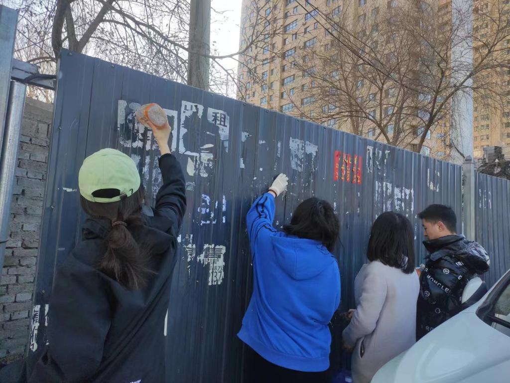 首先,青工委员李杰丽给同学们讲解了这次志愿服务的主要工作,每一个志愿者都要了解自己的任务与分工,随后志愿者们带好了需要用到的必要工具,走到了学校附近为电线杆清理小广告。各个部分分工明确,每个人都用自己手上的工具互相配合,总共分为两部分,从中间向两边分开清理。处理的地方包括电线杆、墙角、公交车牌以及电箱,最后志愿者们把清理出来的垃圾都带走扔进了垃圾箱里,大家最后合并到了一处一起进行小广告的清除活动,此次活动圆满结束。