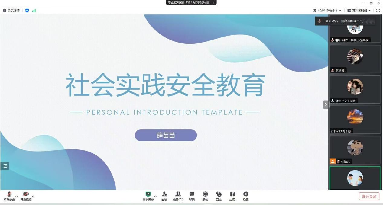 首先,薛苗苗老师简单地介绍了此次班会召开的主题是有关于第四学期社会实践的安全教育的内容。其次,薛苗苗老师主要地讲述了安全教育的主要内容有哪些,有交通安全、日常生活安全、活动安全教育、自然灾害中的自我保护教育。最后,薛苗苗老师对此次班会做出了总结,希望全体同学对此次班会内容牢记在心,并希望动画221班和视觉221班还有计科21级共五个班级在第四学期社会实践中认真遵守学校的规章制度,顺顺利利地完成第四学期的社会实践任务。
