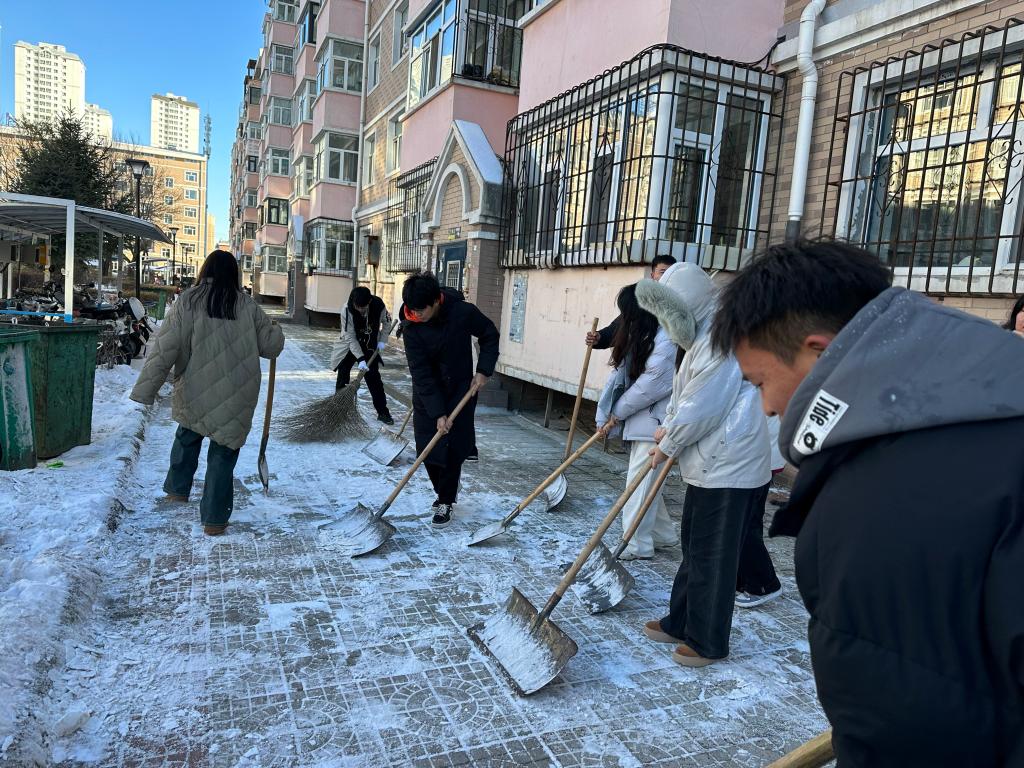11月23日下午 ,大数据231班开展了社区志愿扫雪活动,志愿者们向通航社区彩虹街道党群服务中心进行志愿扫雪活动,由青红委员孙一林组织,共有15名志愿者参加。