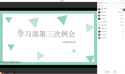 12月10日晚,信息工程系学生会学习部部长徐明金以腾讯会议的方式召开信息系学习部第三次例会,由信息工程系学生会学习部部长徐明金主持,参会人员有信息工程系学生会学习部部员。