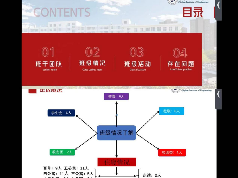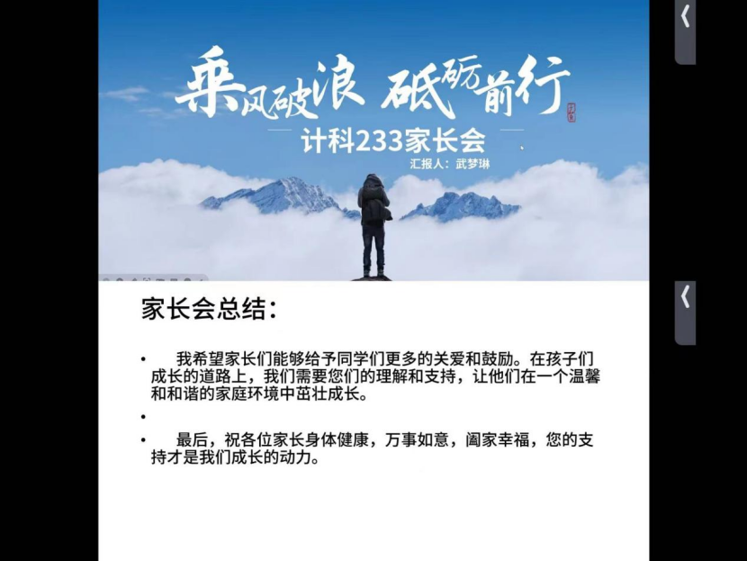 会议在晚上7点准时开始。会议流程紧凑,内容丰富。辅导员杨佳佳向家长们讲解了关于学校的校规校纪、请假等问题,鼓励家长在学生大学生活中适度给与他们独立的空间和时间,培养学生独立思考和自我管理,学会自己解决问题、沟通问题。临近考试周,杨佳佳老师再次向家长们解读诚信考试的重要性,并希望家长与辅导员共同督促学生诚信考试,随后由计科231-233班班长依次进行学期报告总结。计科231班班长门佳兴向各位家长介绍了班级组成情况和入学至今班级同学获荣誉情况。计科232班班长王中旭从班级各个角度分析汇报进行总结。计科233班班长武梦琳进向家长们介绍了班级情况,并汇报了班级的未来目标。