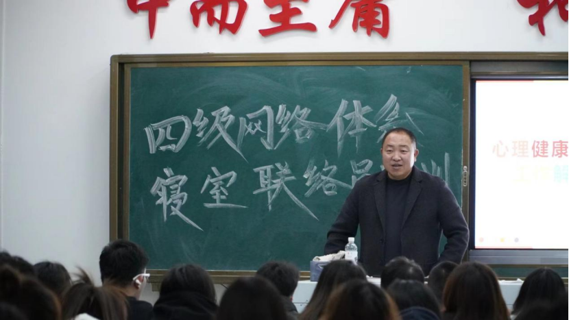 孙晓芳书记认为寝室长与班干是学生安全稳定工作最基础的单元,责任重如泰山,同时作为学生干部,理应关心呵护好同学们的身心健康。他希望寝室长应牢记三个关键词:警惕、关爱、带动;熟悉四个知:知道网格区域、知道工作职责、知道危机常识、知道帮扶对象;做到四个能:能赢得信任、能发现问题、能及时上报、能力范围内化解矛盾;保持五颗心:公心、热心、耐心、诚心、同理心。 “学校已经搭建‘辅导员-党团学生干部-班级干部-寝室长’四级网格管理体系。”对各级网格员的具体职责和工作要求进行部署。他希望网格员牢记职责,及时发现问题、反馈问题、解决问题。孙晓芳书记也表达了对网格员的期待,希望大家通过履职培养主人翁意识,把寝室或班级当作自己的家,把同学当作自己的家人,在日常学习生活中关心自己、关爱家人。