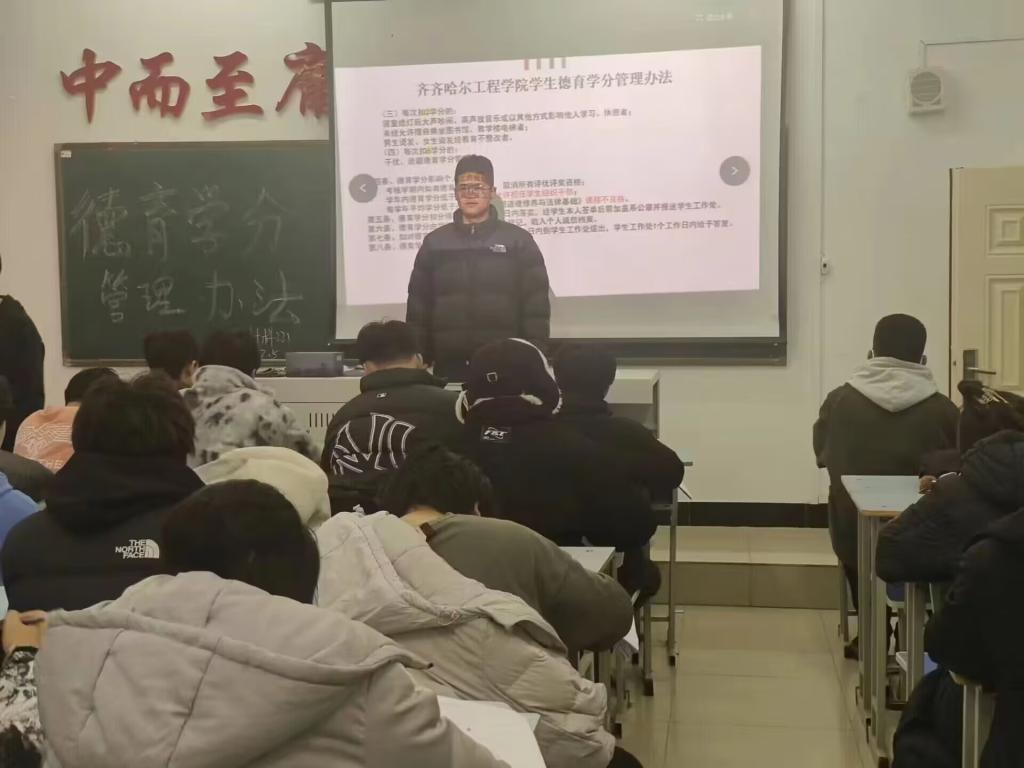 会议开始,班长李双良先是讲述了有关德育学分更改的管理办法,强调了男女交往关系不当,以及寝室就餐乱扔垃圾等行为,其次,班长李双良强调德育低于10分将会取消班内所在职位,低于6分将会重修思政科,在考核学期内被扣德育会取消评奖评优的资格,最后,班长李双良提出如果对于德育学分扣分有异议可以向学生工作处发起申请。