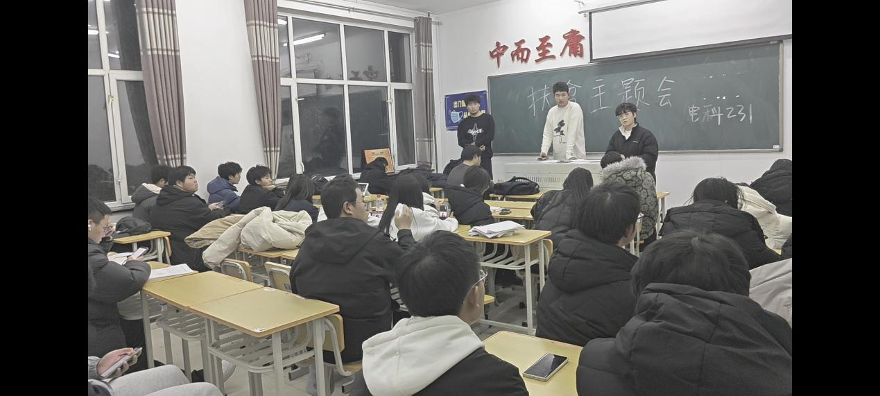 11月22日晚上,电科231班在一教学区1105举办了扶贫主题班会,由信息工程系辅导员张莹主持,学委崔建宇、团支书吴京辉辅持,此次会议电科231班共36人参加。