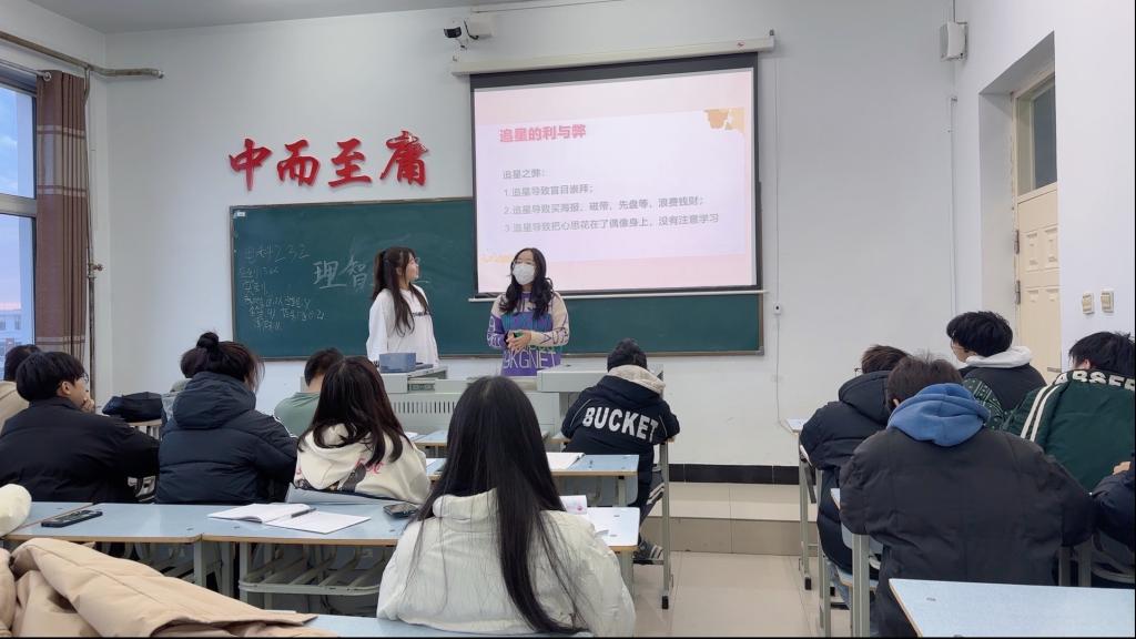 本次班会的目的是引导同学们摆正追星的心态,明确追星的利与弊,将追星转化为自己学习的动力。班会首先,王同学就最近网络热点杨颖和张嘉倪是否参加了疯马秀来进行展开,通过这样一个具体的事例希望同学们能够擦亮自己的双眼,看到这件事情的严重性,能够回归正常的价值观念。之后,张同学讲解了追星对于日常生活的利与弊,正确的追星能够使人变得更加优秀,而不理智的追星只会消耗自己的时间精力甚至金钱。随后,王同学认为人们之所以追星,是因为人们渴望成功,而梦想却始终很遥远,偶像就像是我们前进的一个方向。最后,张同学希望同学们能够理智追星,努力成为自己想要的样子,为实现自己的人生理想而奋斗。
