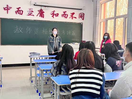 张晶老师为大家介绍了本次讲座的主要内容,由于大家刚参加完普通话考试,在准备笔试环节比较迷茫,应同学们需求为大家邀请黄晓蓉学长来介绍她备考教师资格证的复习情况。黄晓蓉学长在去年11月份考试中一次通过笔试和面试。她推荐大家主要复习粉笔书籍和教案,并在网上看讲座课,并重点讲解了准备40分钟的试讲内容。最后学长告诉同学们考教师资格证在面试的时候不要紧张,同时也要好好学习如何写教案和板书。