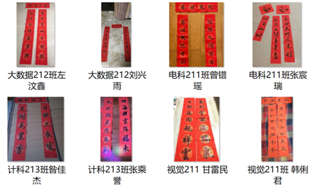 活动开始前,由宣传部部长聂羽轩首先通过QQ宣传的形式积极宣传本次活动。随后,活动正式开始时,聂羽轩同学明确开展本次“家中笔墨迎新春,用心挥毫送祝福”活动目的:希望能够通过本次活动,让同学们品味春节的传统以及与家人共度除夕的快乐,同时也能感受到中国传统文化带来的快乐,并将这份传承保持下去,传递给更多的人。之后,聂羽轩同学通过QQ的方式发布本次活动的要求,希望各班级团支书积极组织班级同学参加本次活动,并能够围绕活动主题自主书写春节对联,以班级为单位于2月6日前将作品统一上交负责人后选出优秀作品。最后,通过本次活动,计科211刘贝贝、计科212韩鑫瑞两名同学获得一等奖,计科212王思懿等三名同学获得二等奖,大数据212左汶鑫等四名同学获得三等奖,计科193李思寒等五名同学获得优秀奖。