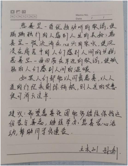 11月23日中午,慈善社团在1教学区1213教室开展心语心愿活动,征集大家的心声与感悟以及对社团的建议。