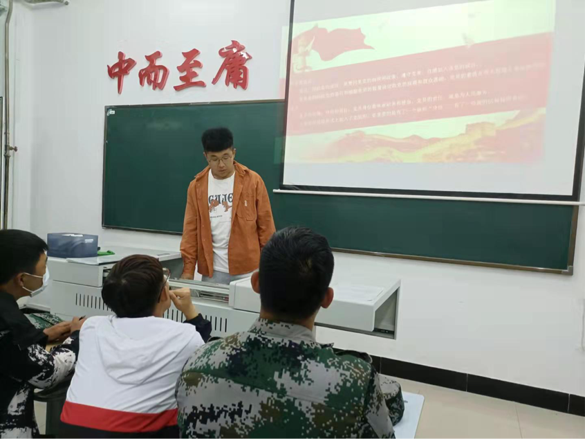会议伊始,朱文旭对本次班会内容进行简要介绍。期间,朱文旭首先向同学们详细的介绍了中国共产党党组织的发展历程。随后,朱文旭对党的性质与章程做出介绍,接下来朱文旭向班级同学详细介绍学院入党流程,并对信息工程系计算机与电子专业学生党支部的领导小组进行介绍;其次,朱文旭强调:“我们应该端正入党动机,明白中国共产党就是要全心全意服务人民。”最后朱文旭为大家详细介绍了年满18周岁的新生入党的相关程序,其中包括入党申请书的书写以及后期成为预备党员后的相关事项。