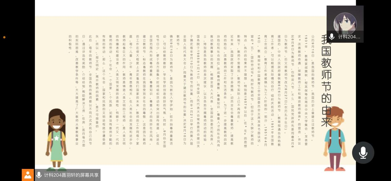 2021年9月10日星期五下午,计科204班于腾讯会议开展“金秋九月,难忘师恩”主题团活,本次团活由团支书马赫主持,班级47人参加本次团活。