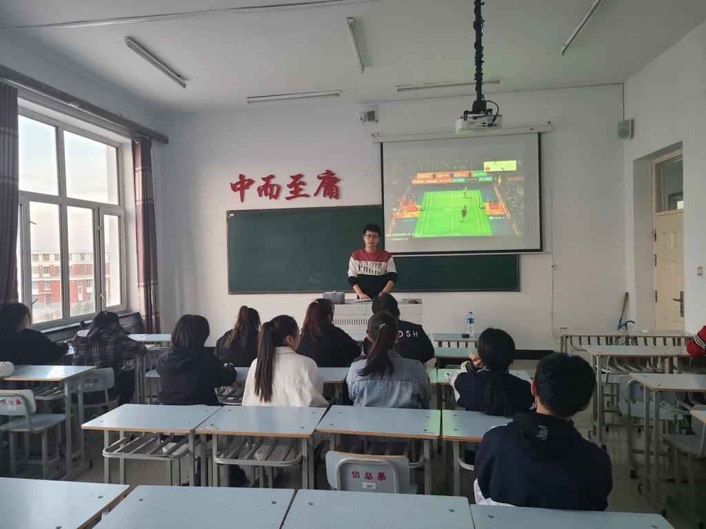 首先,主持人上台为社团成员们讲述在进行羽毛球运动前的热身动作,头部运动、压腿运动、脚踝运动、手臂运动、肩关节运动、腰部胯部运动等,使同学们在平常的运动与训练当中做好自我防护,以免手臂脚踝等出现扭伤等情况。随后,利用大屏幕播放国际羽毛球比赛视频让大家了解到更多的羽毛球得分技巧,学习羽毛球的基础步法,社团成员们互相讨论,交流经验,分享自己的对羽毛球的动作规则的见解,为下周比赛做准备。最后,社长张宏宇为同学们想法提出了不同的意见,并要求同学们在进行羽毛球练习时要熟练掌握所学的技巧与比赛规则。